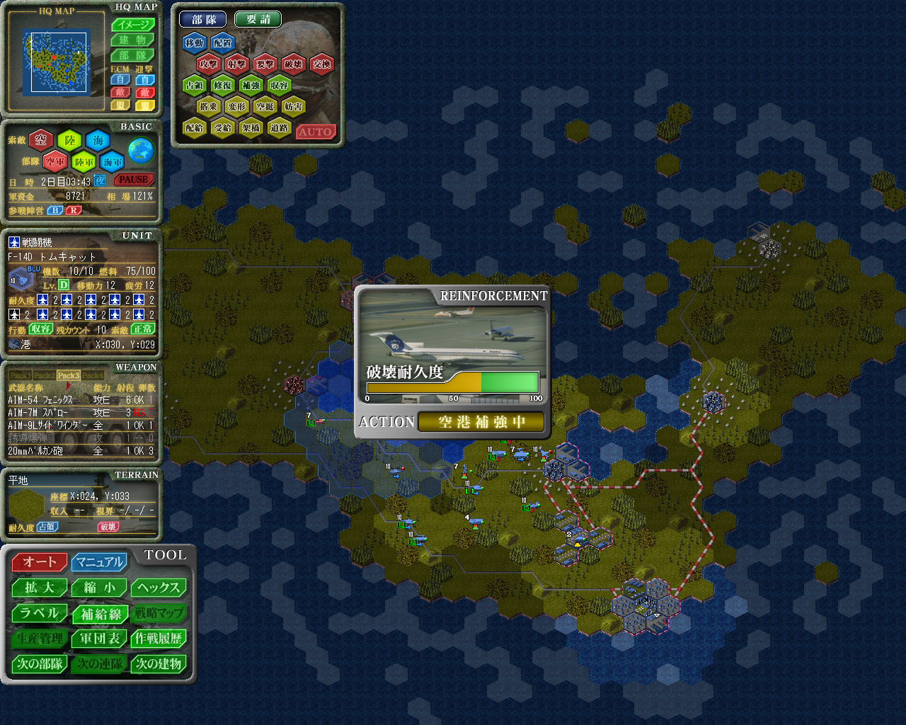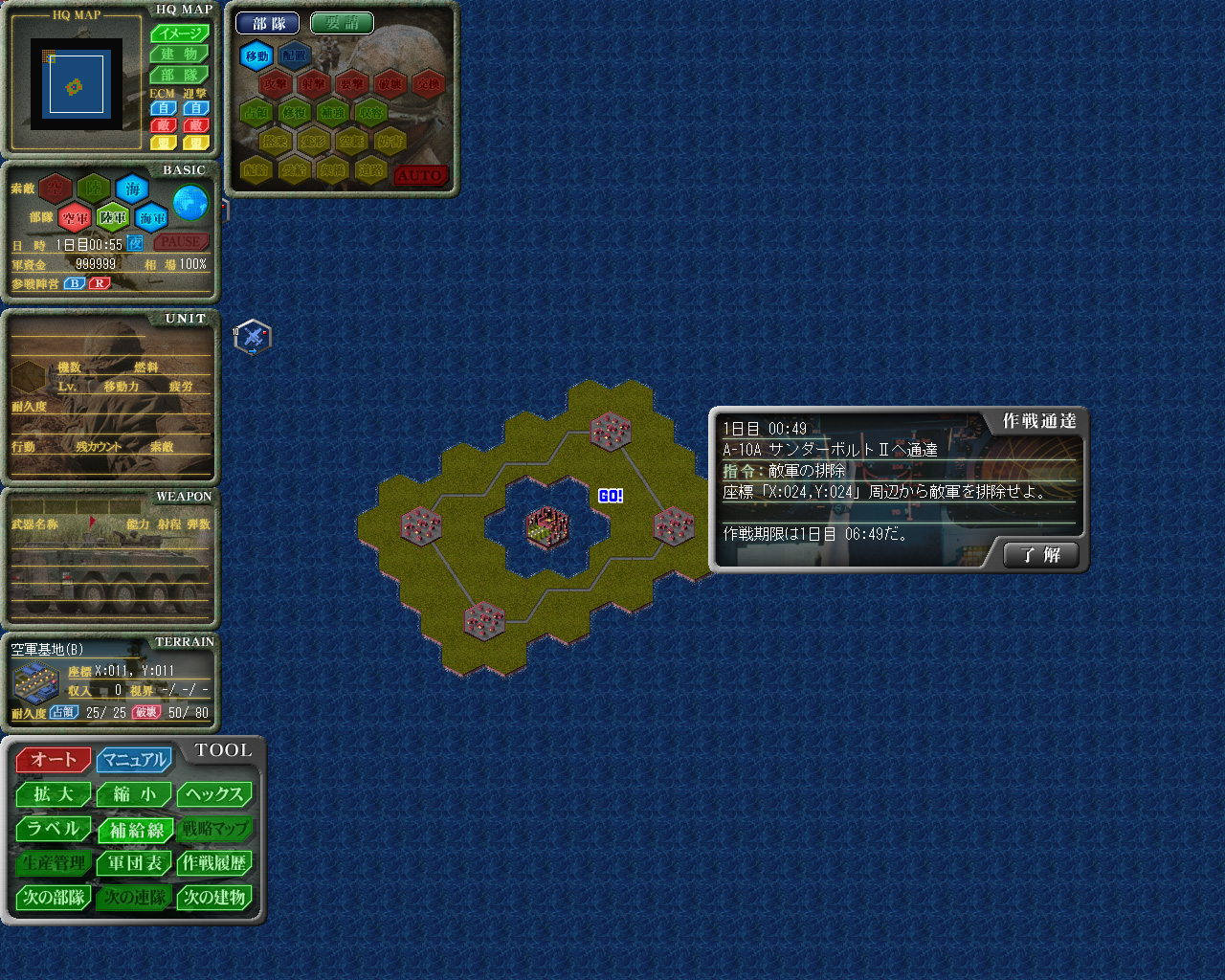 一応,初期設定でAI担当部隊に侵攻重視,防御重視,攻防のバランスを取る,といった大まかな行動指針は与えられるが,侵攻ルートや都市への攻撃,ユニット生産などの具体的な指示は出せないし,師団長以上にならないとユニット生産もできない。