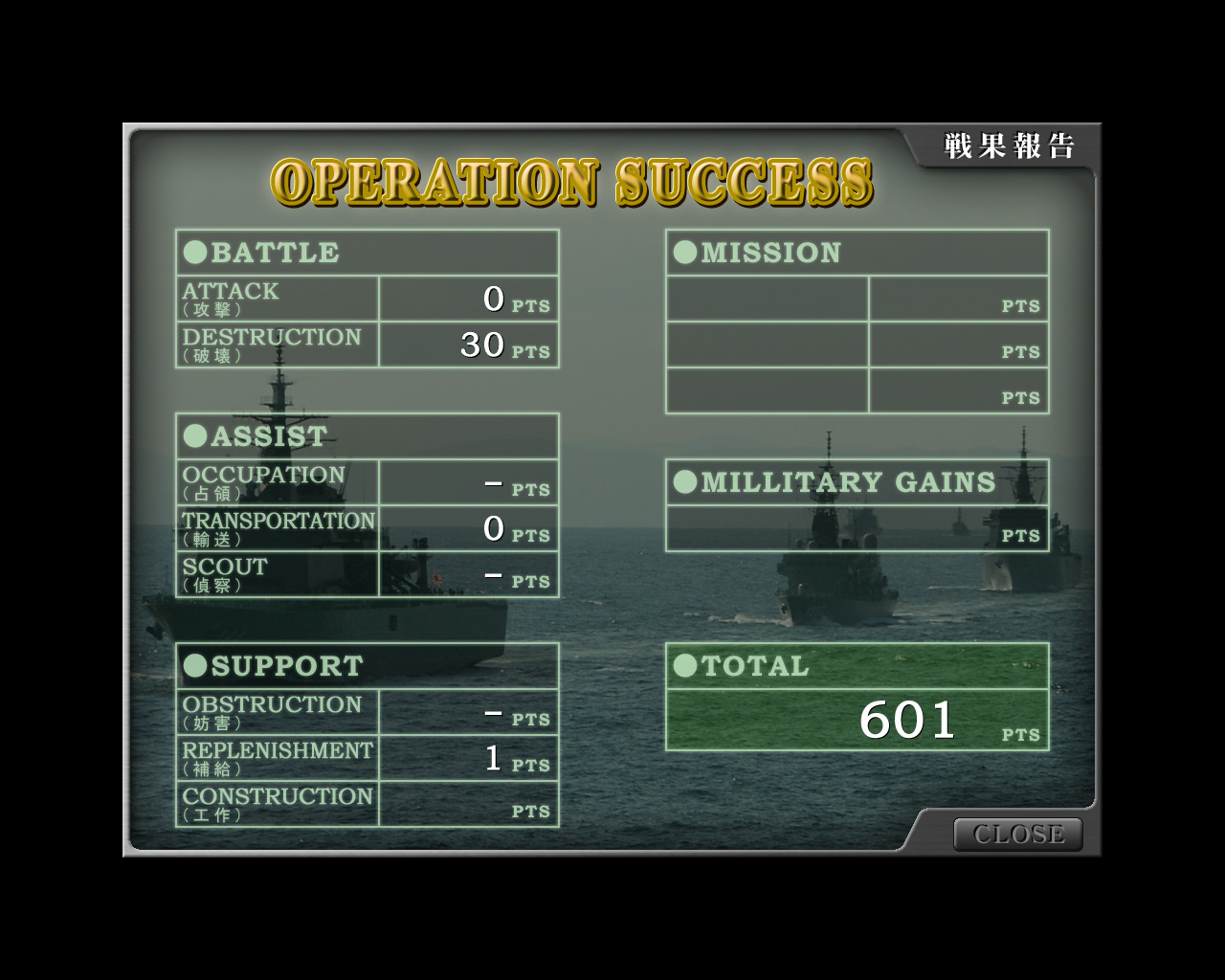 | 敵の索敵ユニットは優先破壊目標だ。また工作車など修復/占領の能力がある部隊も先に潰したい | 高価だが使い勝手のよいイージス艦。索敵だけでなく,敵の進撃阻止や防空などさまざまな用途に役立つ | 敵ユニットを全滅させて勝利! 今作では勝ち方が「評価ポイント」という形で昇進に響いてくる |