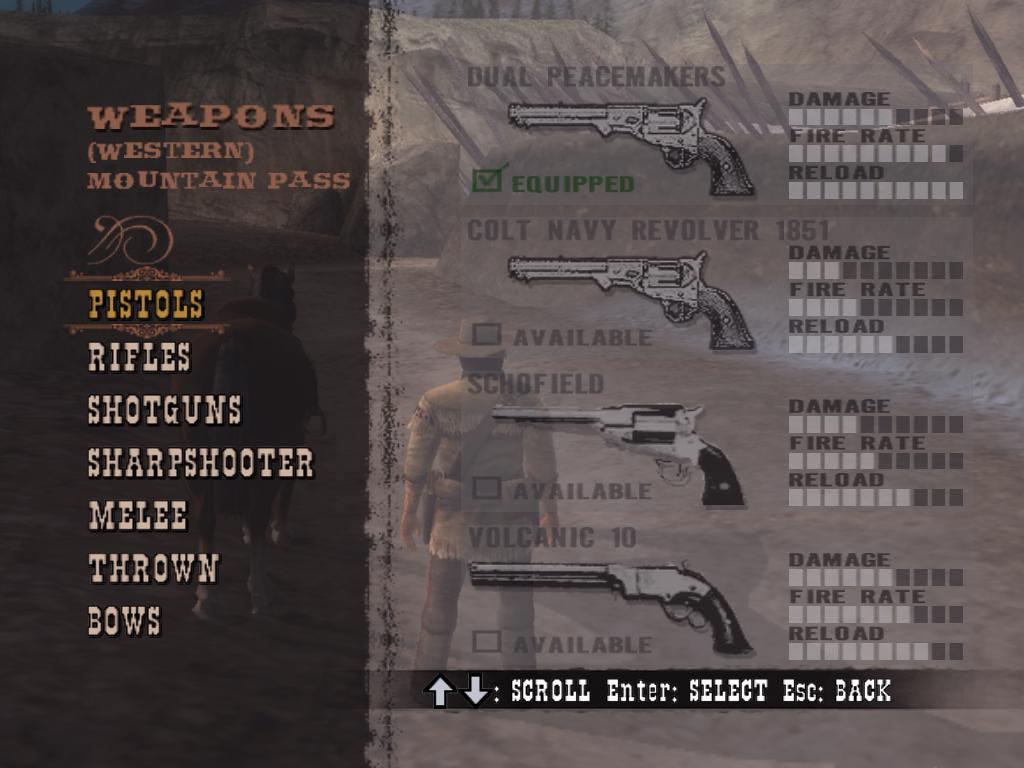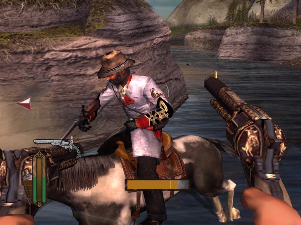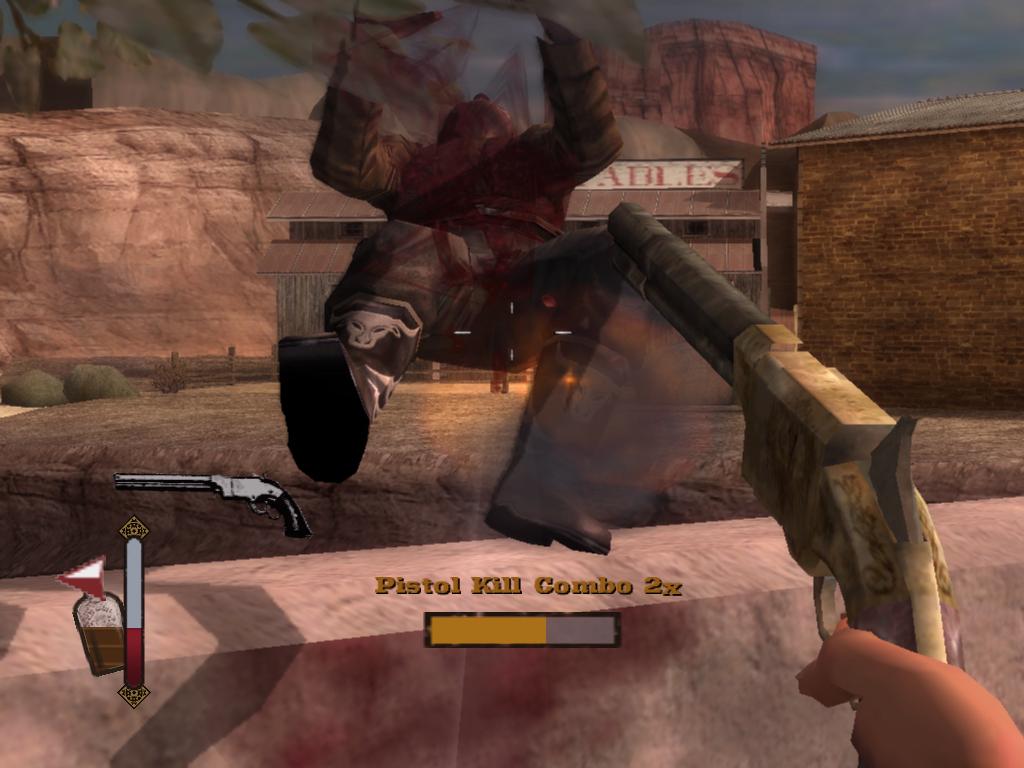 | 2丁拳銃でQuickdraw(バレットタイム)。拳銃は,なぜか弾数制限がなかったりと優遇されている。今では芸術品として扱われそうな象牙グリップの美しい銃も登場 |