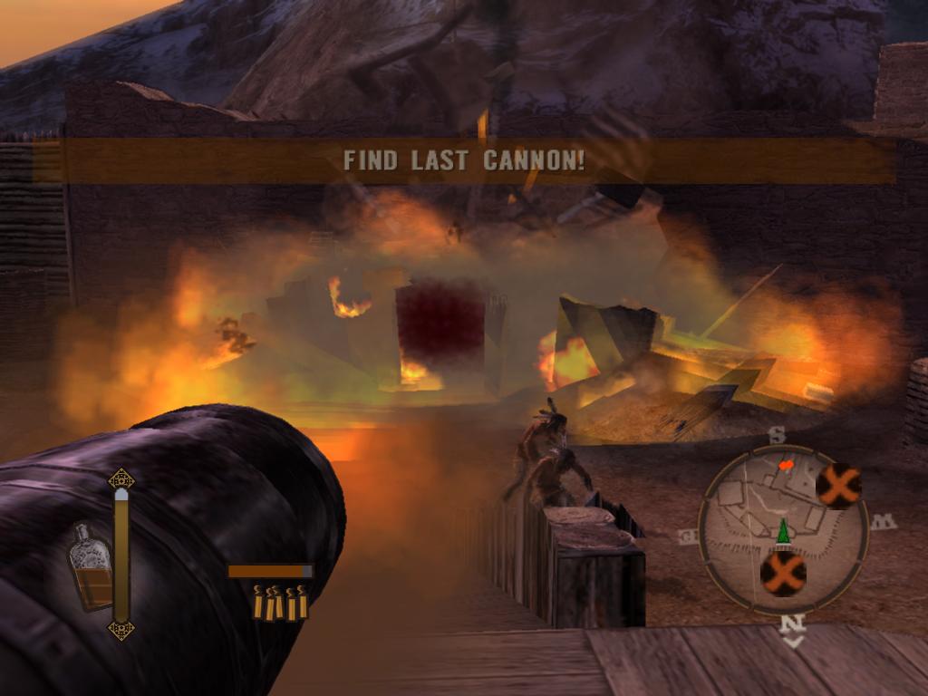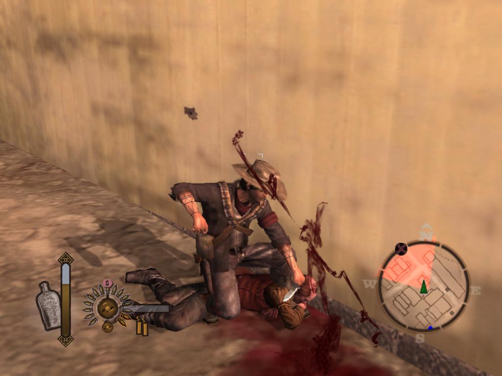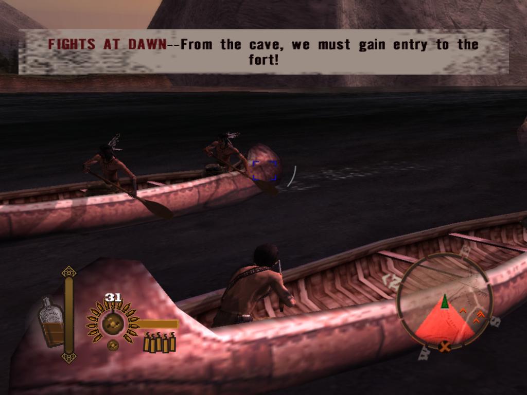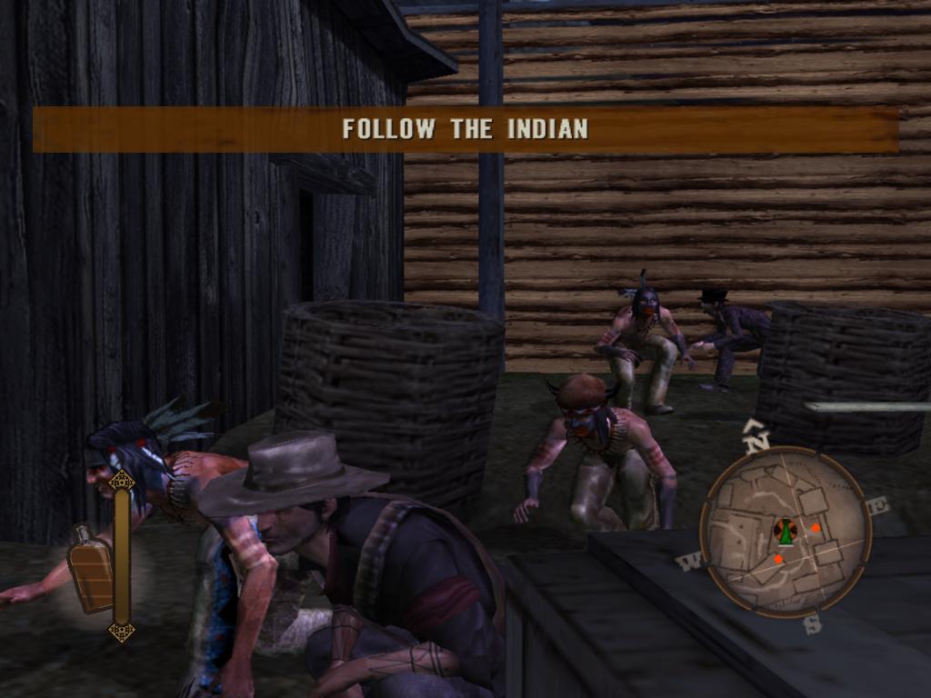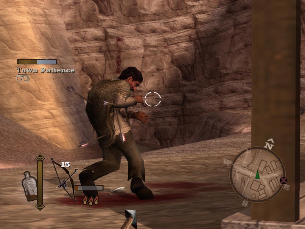 | 膨大なテキストは,やはり英語の苦手な人(例えば筆者)にはつらい。ラッセルの人,頑張ってください | 物語の中盤からは,ネイティブアメリカンと深く関わるColton。弓も彼らからもらったようなもの | 途中で手に入れたサーベルで,街の人を切り刻んでみた。しばらくすると,保安要員に取り囲まれた |