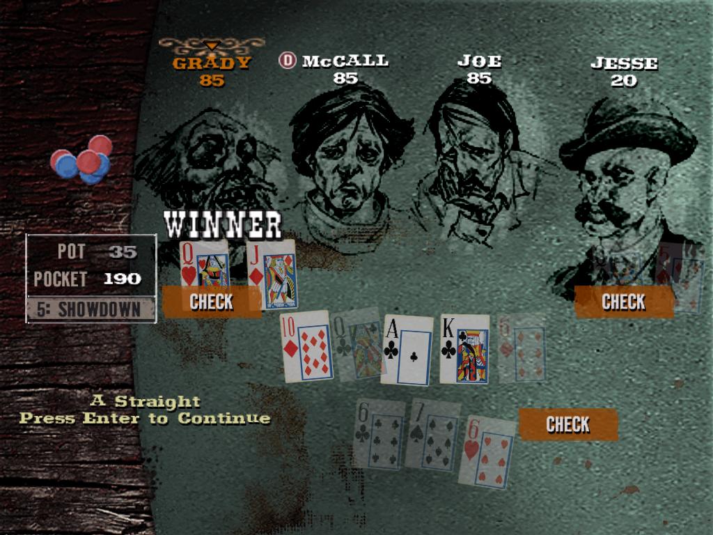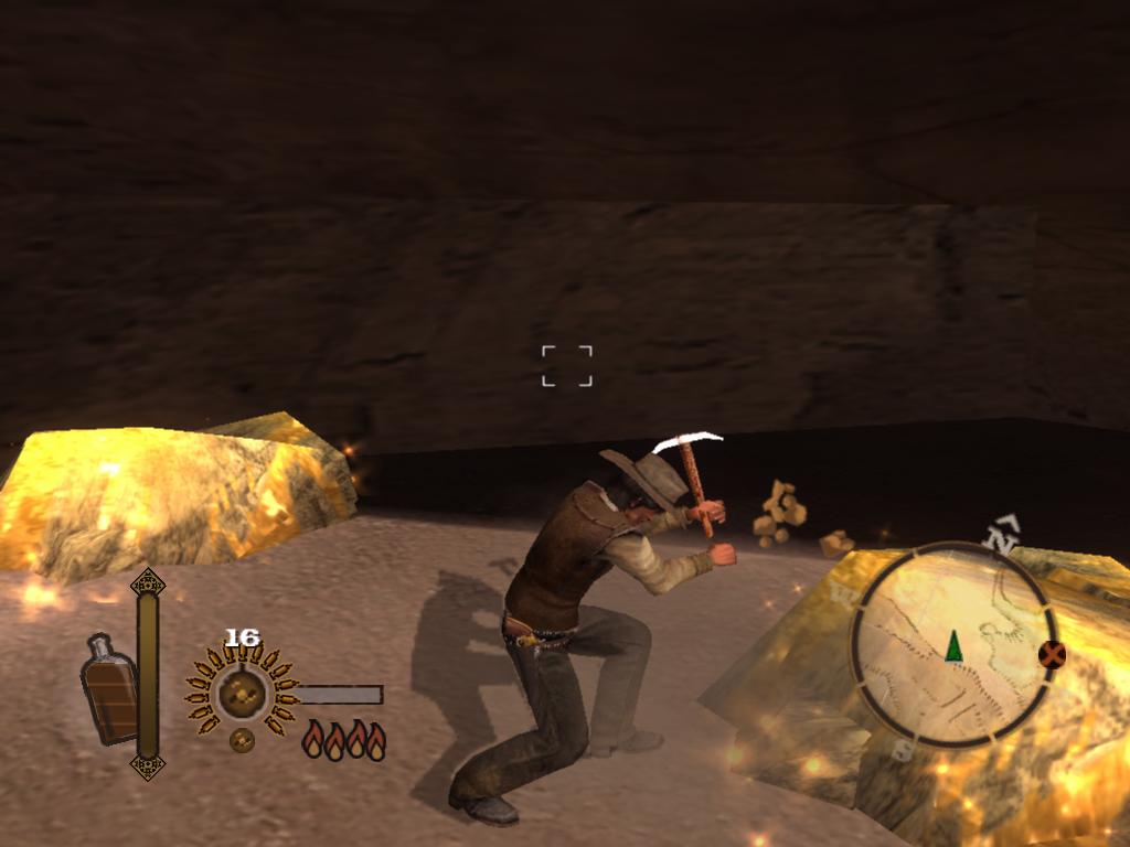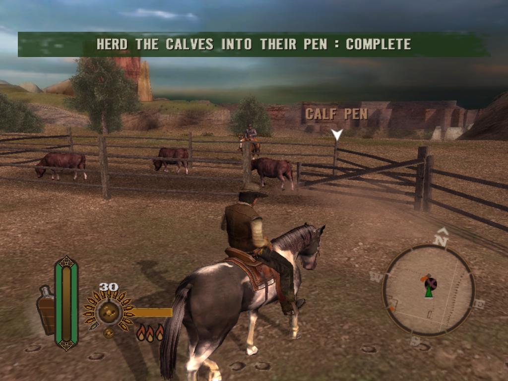 | この時代といえば,やはり金。いくらゴールドラッシュに沸いた時期とはいえ,本当あちこちに金山がある | 賭けポーカーで小銭稼ぎ。これで一攫千金も? とドキドキしたが,残念ながら報酬は一定。チッ | 馬を使って,牛や馬を囲いまで追い込む牧歌的なミッション。面白いけど,俺様を誰だと思っているんだ |