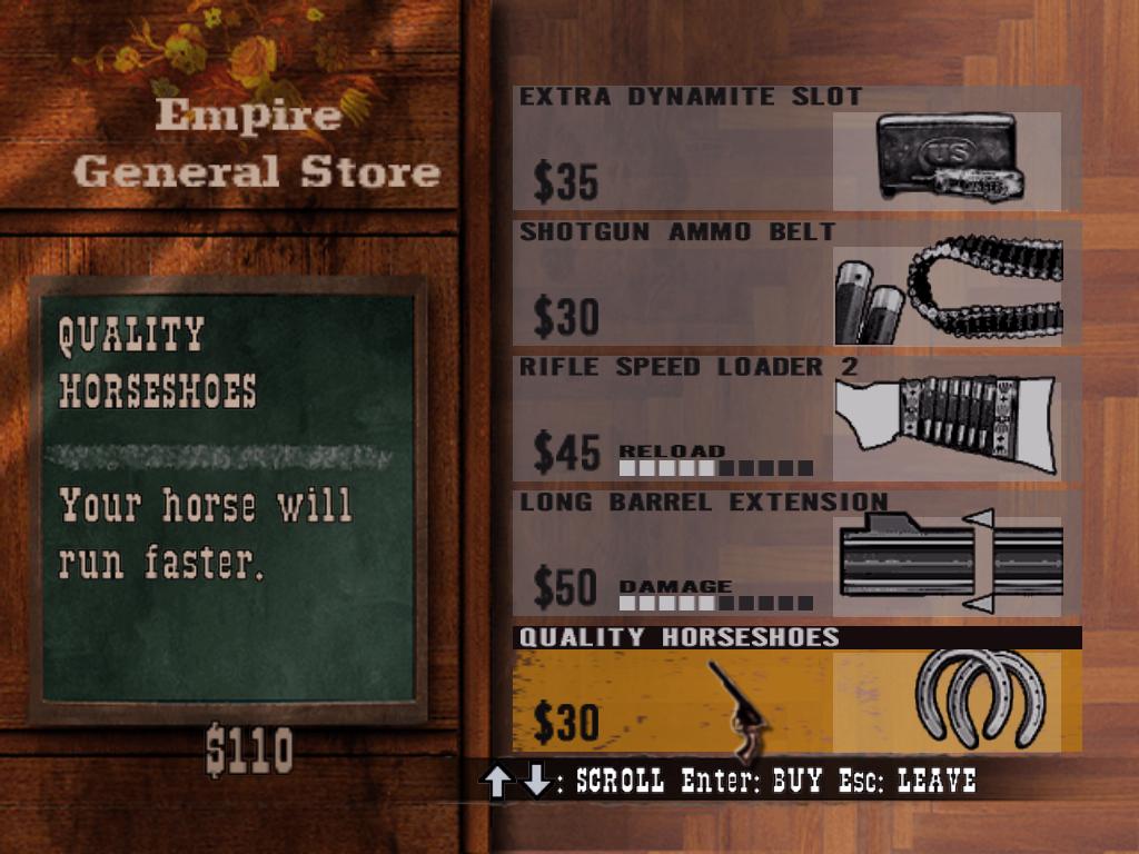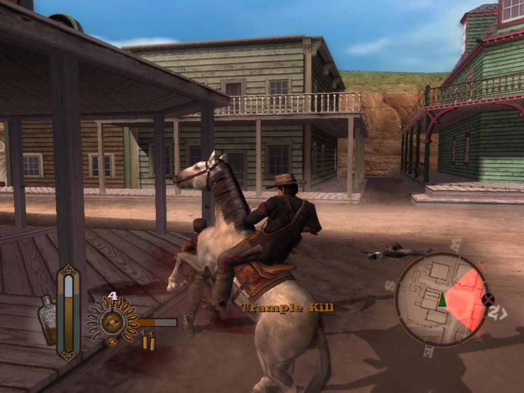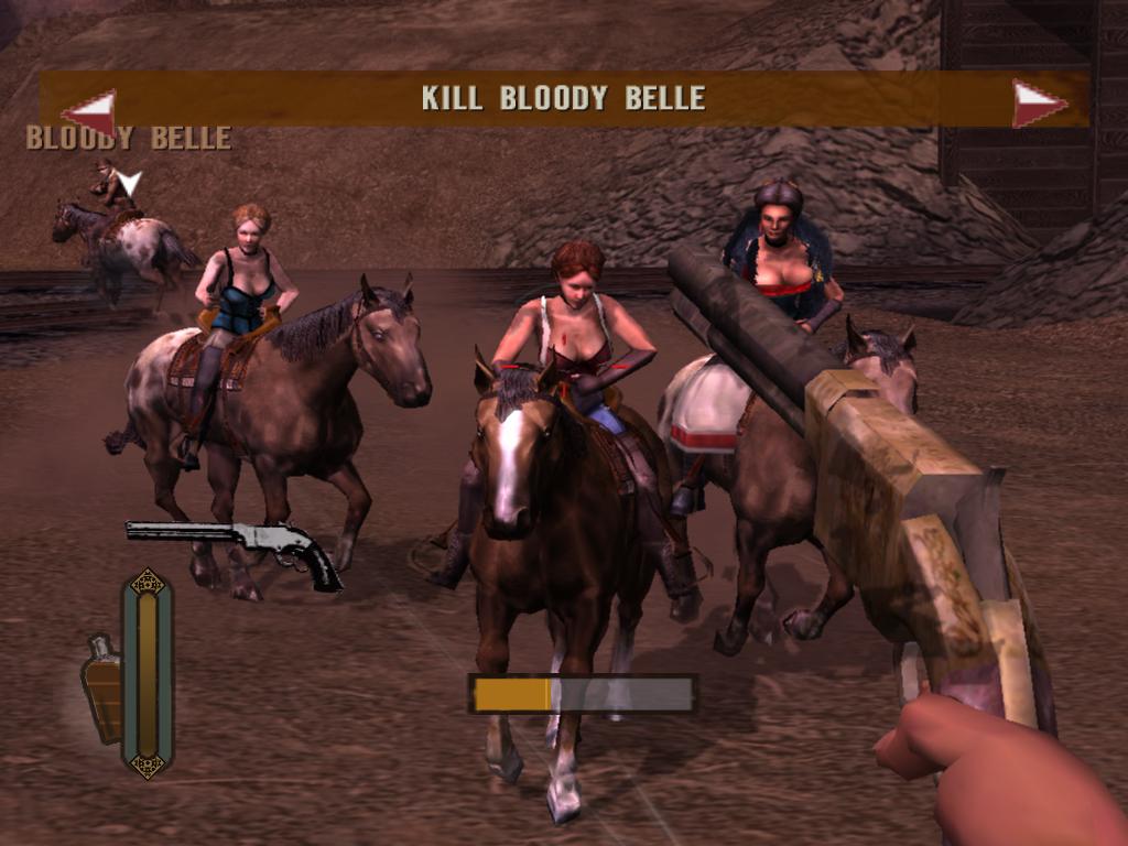 | うーむ,やはり個人的な本作最大の見どころは「馬!」としか言いようがない。人を踏むと「Trample Kill」 | 美女が3人も襲ってくるではないか! なんだか撃つのはもったいない気もしつつ,眉間を狙ってズドン | ショップアイテム。弾切れのタイミングは少ないので,予備弾薬の装備スロット拡張はいらないかも |