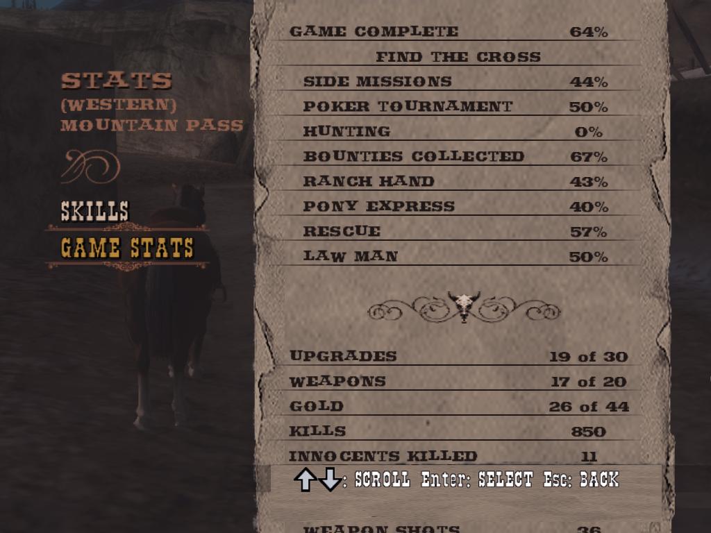 また本作には,サイドミッションの達成具合や,ヘッドショットの確率,乗り潰した,または撃ち殺した馬の数といったColtonの行動が逐一記録されており,いつでもそれらデータを閲覧できるようになっている。こうなってくると俄然コンプリート魂に火がついて,ストーリーそっちのけで遊びたくなってしまう。さらにサイドミッションすら無視して,GTAライクに弾が尽きるまで市民を撃ち続けることもできる。