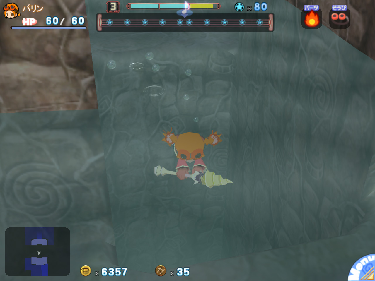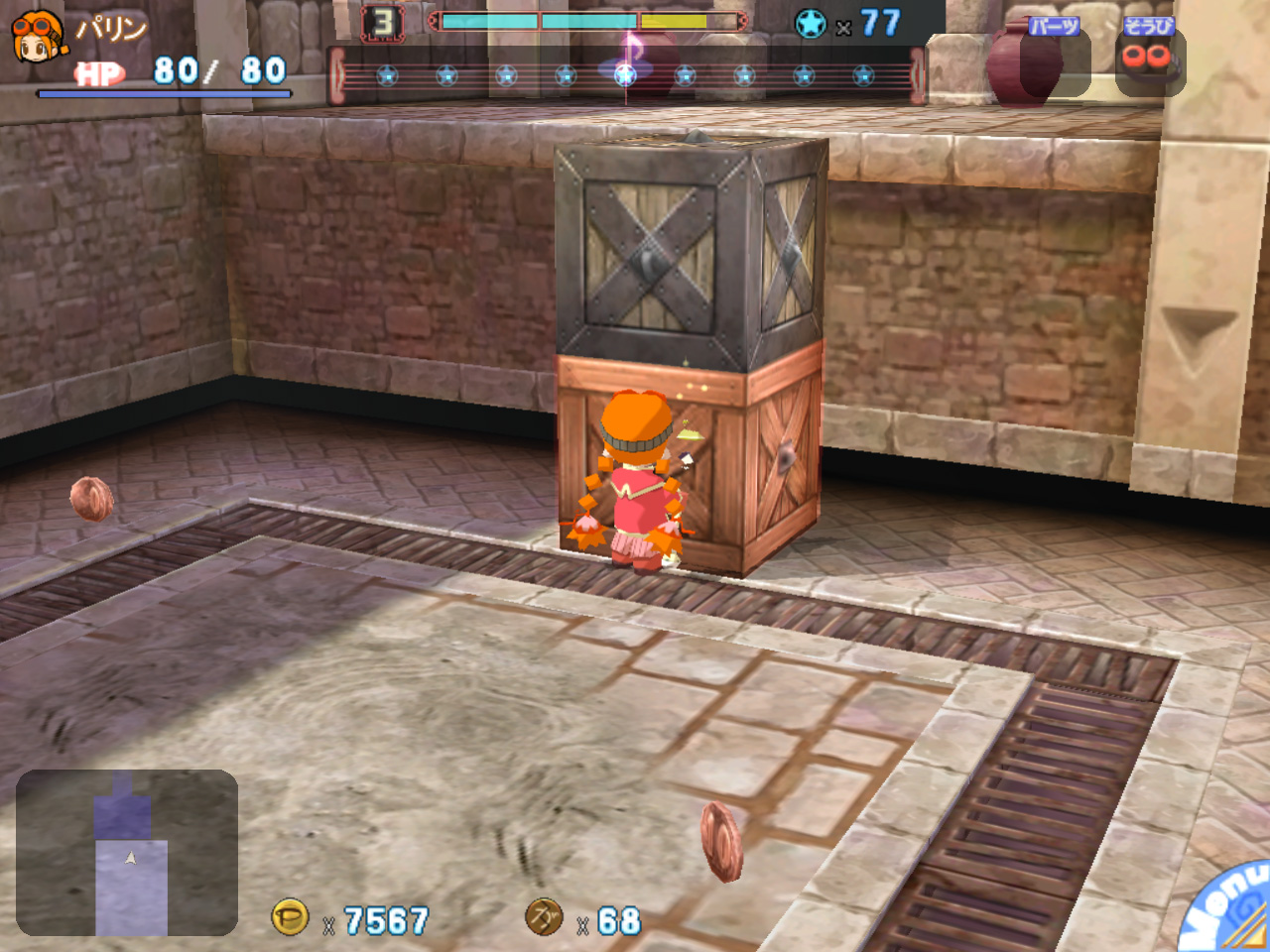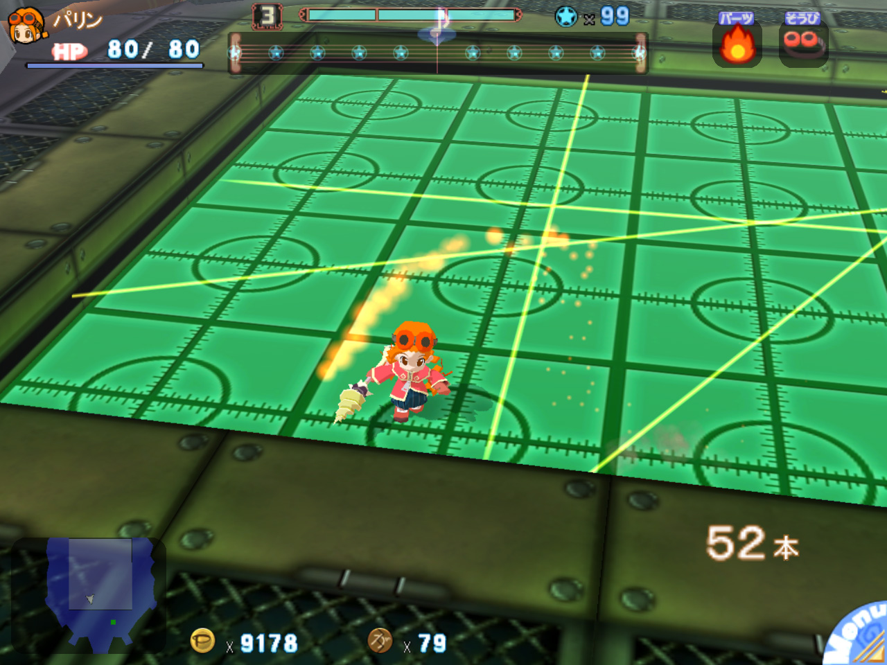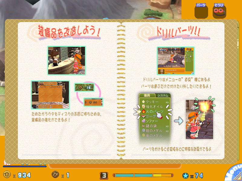 そんな二つの顔を持つアクションではあるが,本作のゲームシステムは単純明快。少女が敵を倒すために使う武器は,なんとドリル1本のみ。このドリルには「パーツ」を追加することで,火や雷といった属性が付加され,それぞれの特性を活かした攻撃が可能となるのだ。 ほかにも,トラップや水によるダメージを軽減できる「そうび」アイテム,より強力な攻撃が繰り出せるようになる「必殺技」のアイテムがあり,これらは街で購入することで使用可能になる。 戦いの場となる遺跡や森などの各ステージは全体MAPの各所に点在し,ステージをクリアすると徐々に行けるステージが増えていくといった具合だ。
