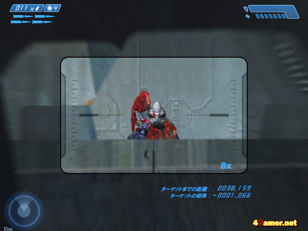 スナイパーライフルの8倍ズーム。本作のスナイパーライフルは弾の装填が速いので使いやすい。ちなみに,画面でターゲットしている赤いグラントは,ニードラーを所持していることが多い |
