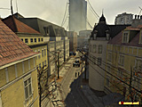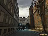 | 東欧風の街が再現されたCity 17。後方の巨大な建造物が,シタデルと呼ばれるブリーン博士の本拠地である。淀んだ空が,強烈な圧迫感を表現している |