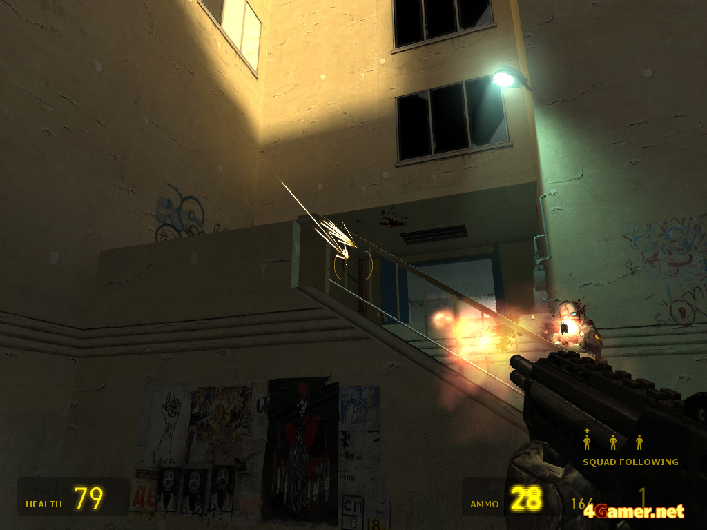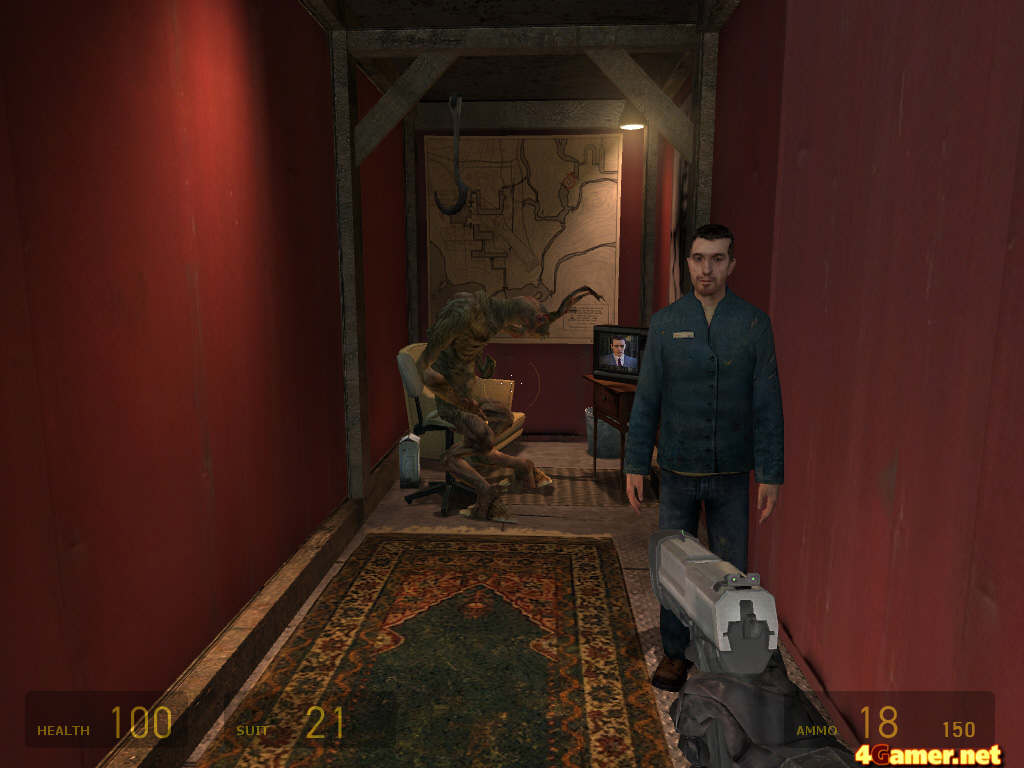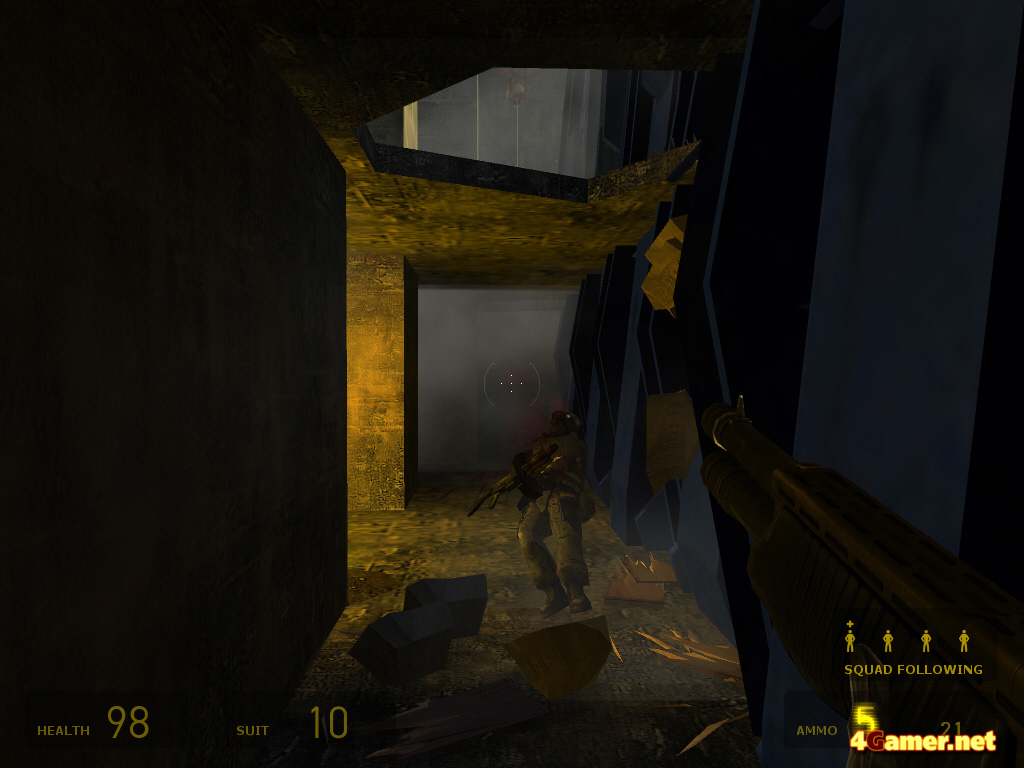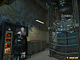 そんなCity 17にも希望はある。それが,ゴードン・フリーマンことプレイヤーの存在である。駅から居住区までの道のりは,比較的自由に散策できる。プレイヤーの姿はゲーム中一度も写し出されることはないが,少なくともこの時点では,ほかの居住者と同じ,番号のついた青い服を着ているのだろう。コンバインに近付いたりすれば殴られるが,受話器の上に飛び乗ってもポスターを一枚一枚見回っても誰も気に止めない。しかしある地点から,NPC達がゴードンの到着を待っていましたとばかりに言葉を投げかけ始め,誘導されながらもゲームは急なテンポで進展していく。