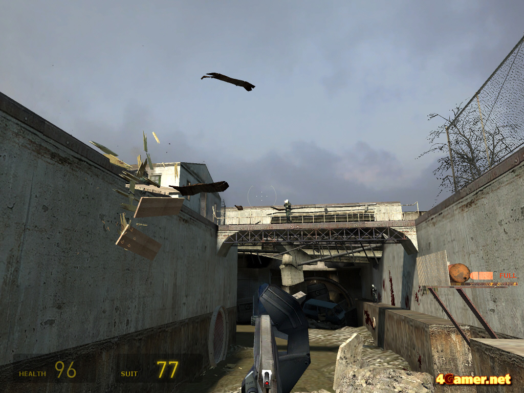 ゲームでは,時折コンバイン兵が設置したマシンガンを使用する局面がある。木っ端微塵に吹き飛ぶ板が凄まじい |