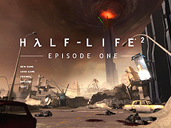 | ハーフライフ2 エピソード1のメニュー画面。チャプターごとに背後の“動く”図柄が変化するのは,前作ハーフライフ 2と同じ。ストライダーの大暴れとコアの爆発により,シタデルのあるCity 17は無残な姿となった | |