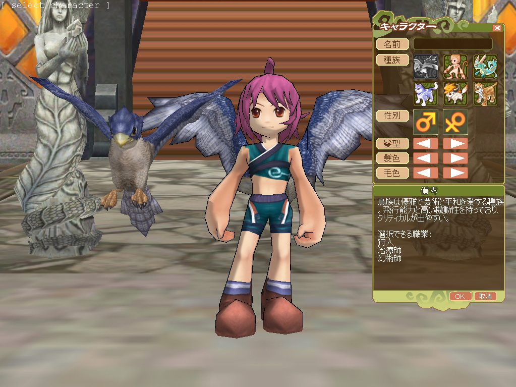 | ●鳥族 火の属性を持つ。狩人,幻術師,治療師に転職できる。人型のときの大きな羽根が美しく,特徴的だ |