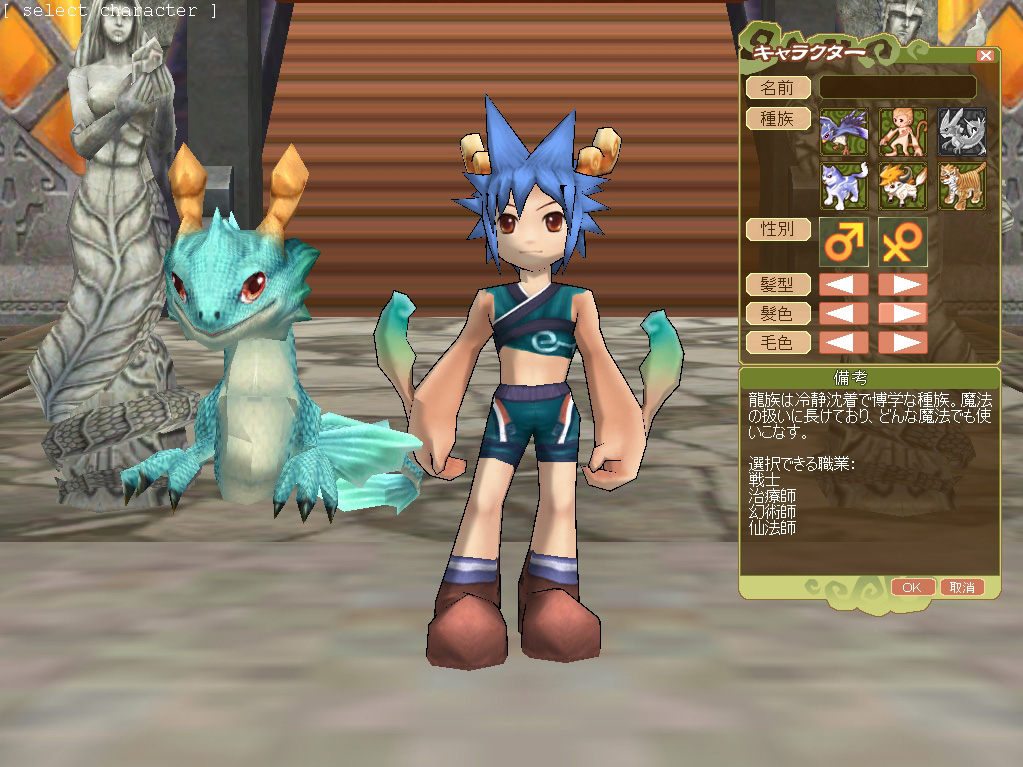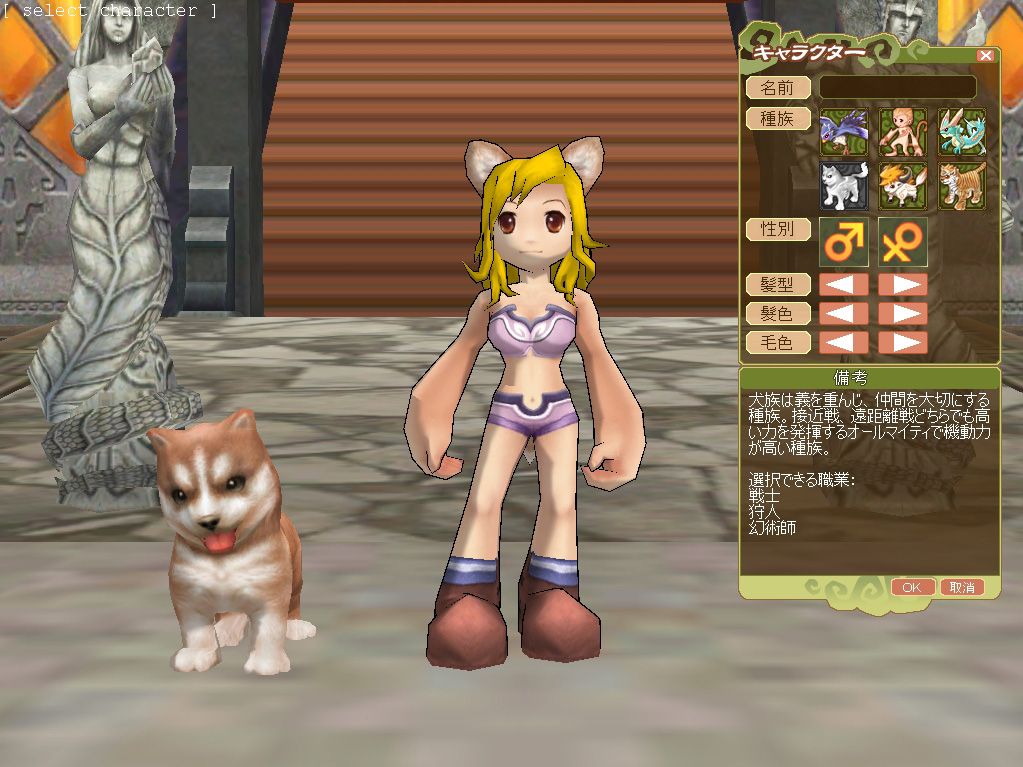プレイヤーキャラクターとして用意されているのは,一般的に知られる「木」「火」「土」「金」「水」の五行に「風」を加えた,6種類の属性に分かれた「獣」の種族で,それぞれ男女が選べる。五行といっても種族間に「相生」や「相克」といった関係が反映されているわけではなく,単にモチーフとして使われているだけのようだ。また,いずれの種族も外観および専用スキルに違いはあるが,今のところ能力自体に差異はなく,レベル5に達したときに転職できる職業が違うだけである。