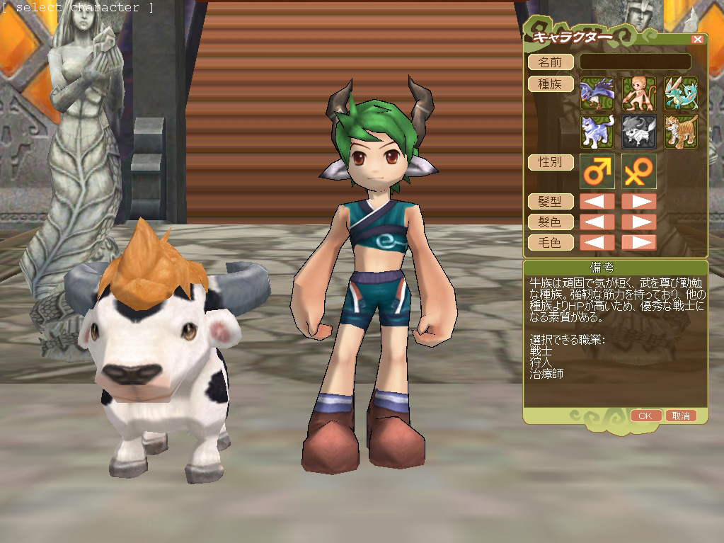 ●牛族 風の属性を持つ。戦士,狩人,治療師に転職できる。獣形態のアンバランスな体型と白黒ブチ模様がキュート |