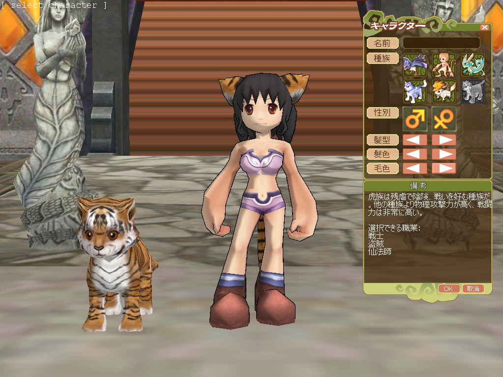 ●虎族 金の属性を持つ。戦士,盗賊,仙法師に転職できる。人型はいわゆる狙った感じの猫耳キャラである |