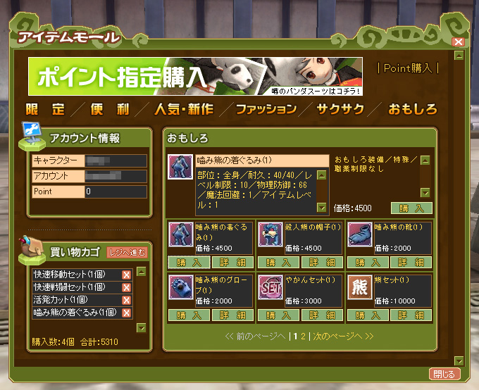 課金形態は「基本料金無料/アイテム課金」で,11月15日に「アイテムモール」に有料アイテムが実装された。有料アイテムの内容は,獲得経験値を1.5倍にするもの,デスペナルティを抑えるものなど。またWWF(世界自然保護基金)支援用アイテムとして,パンダ装備が販売された。これはいわゆるパンダの着ぐるみで,売り上げは全額WWFに寄付されるという。