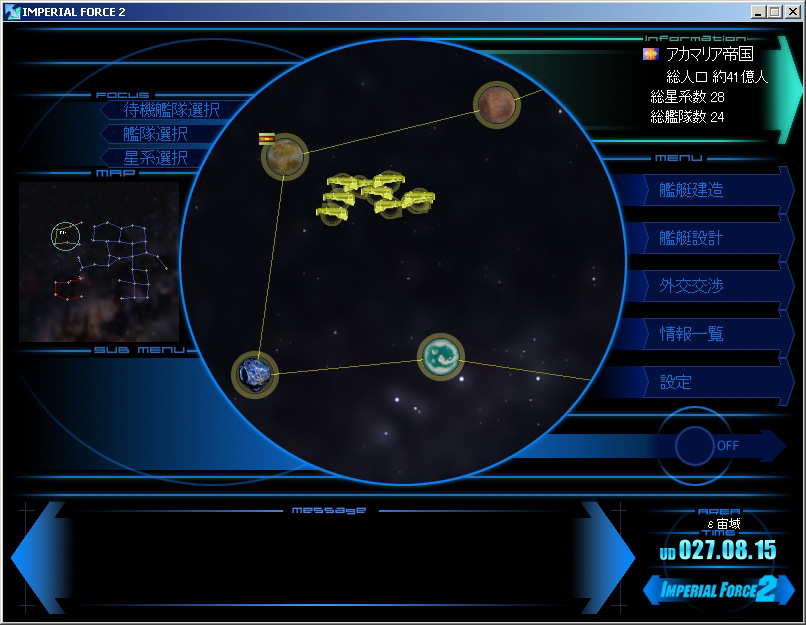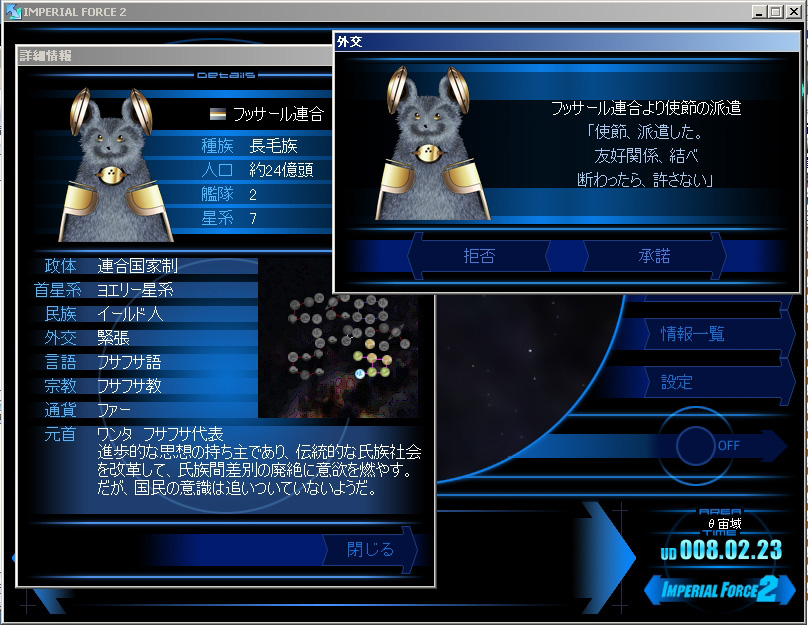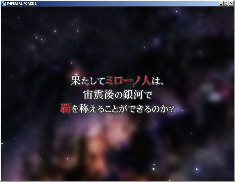 インペリアルフォース2の世界設定は,ほぼ前作のそれ――「宇宙震」の発生で混乱を極めた宇宙空間での群雄割拠――を引き継ぐ。プレイヤーは最初に7系統21種族から一つを選んで国名を付け,マップサイズ/入植率/ゲーム難度を,それぞれ5段階で設定する。するとマップが生成されて,いよいよゲーム開始だ。