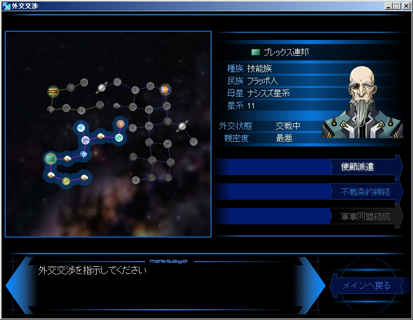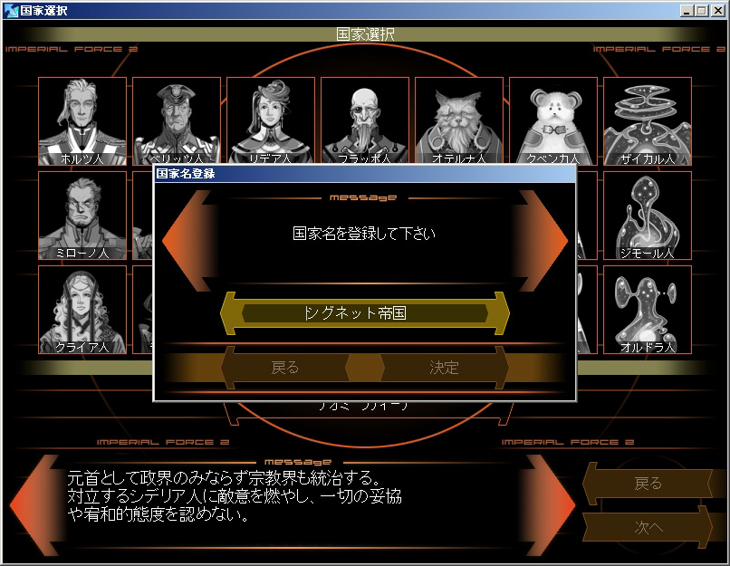 | 7系統21種族の中から担当勢力を選択する。同系の種族同士では,外交関係が親密になりやすいといった設定があるようだ | 国家名はプレイヤーの好みに応じて全角8文字までで付けられる。種族のイメージに合ったカッコいい名前を考えたい | 難易度やマップの広さを設定する。難易度設定が上になると思考ルーチンも強くなり,手応えのあるプレイが楽しめる |