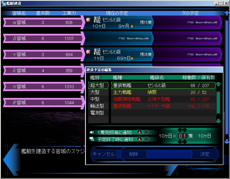 本作のユニット生産には,資金という概念がない。艦艇は,建造指示を出して規定の年月が経過すれば完成する。つまり,まとまった資金を投入して急激な軍拡に出ることは不可能だ。明確な目的を持ち,先を見据えた建造計画が必要になる。