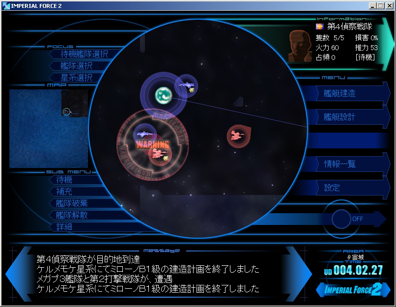 敵対する艦隊同士が一定以下の距離に接近すると,ユニットの位置に“Warning”というリングが表示され,ゲームにポーズがかかる。そこで移動指示を出せば逃げられるし(速度差があると逃げられないこともある),さらに近くの艦隊をリングに突入させれば,最大6艦隊までの兵力を投入できる。