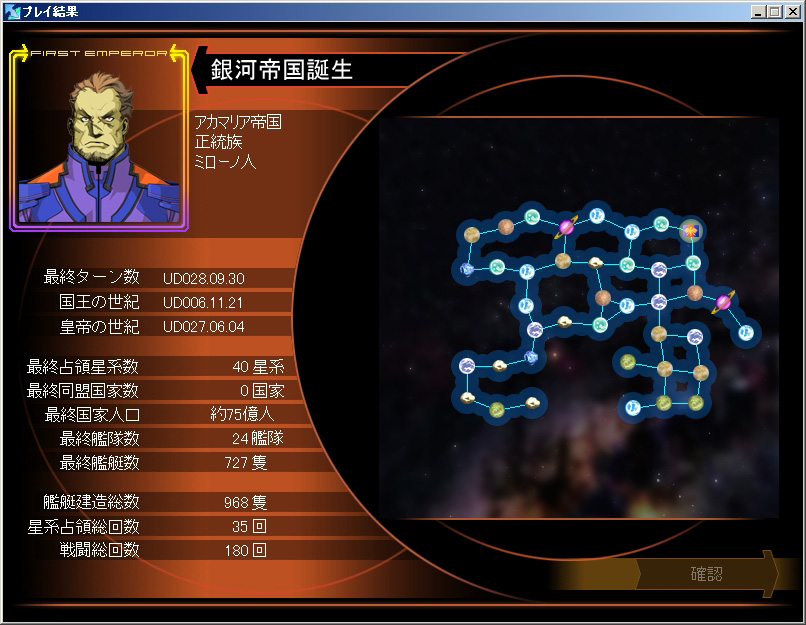 | 艦艇の設計はなかなか楽しい。試行錯誤を繰り返し,自分の戦術に合った個性豊かな艦艇を開発したい | プレイが終わると,その結果が表示される。いずれかの勢力により,銀河帝国が樹立されてエンディングだ | エンディングの最後にあるメッセージ。「3」の存在を暗示しているのか,リプレイ性を強調しているのか |