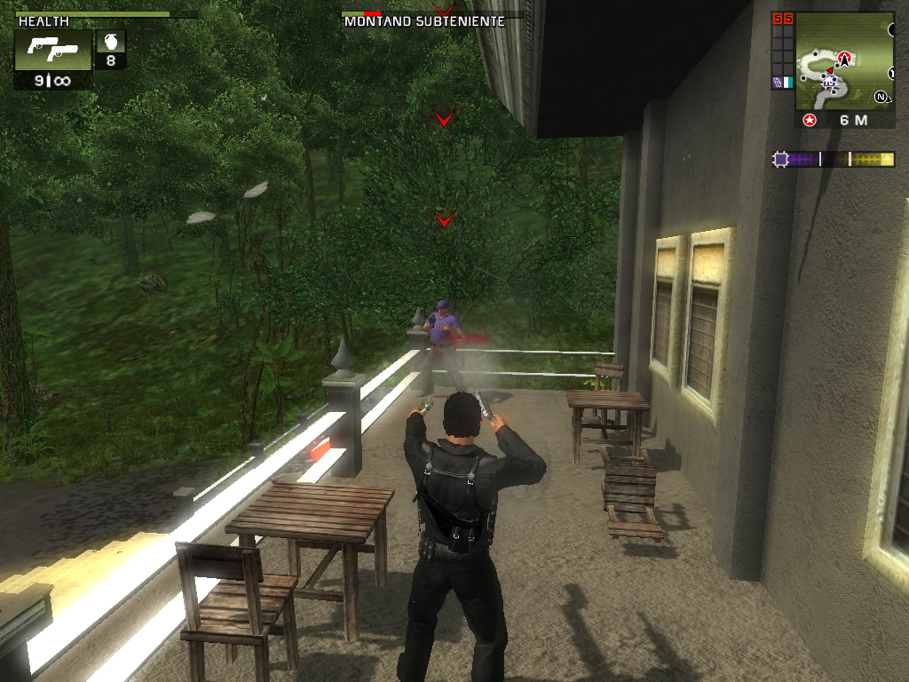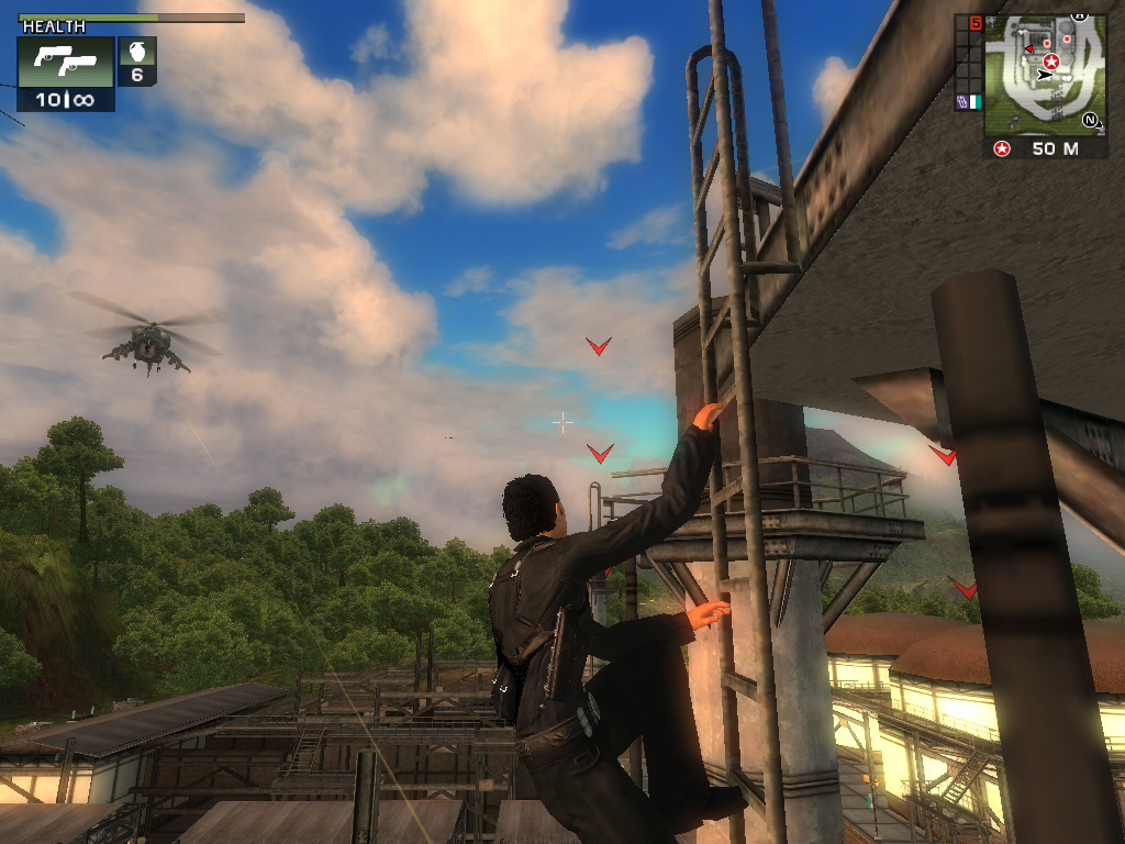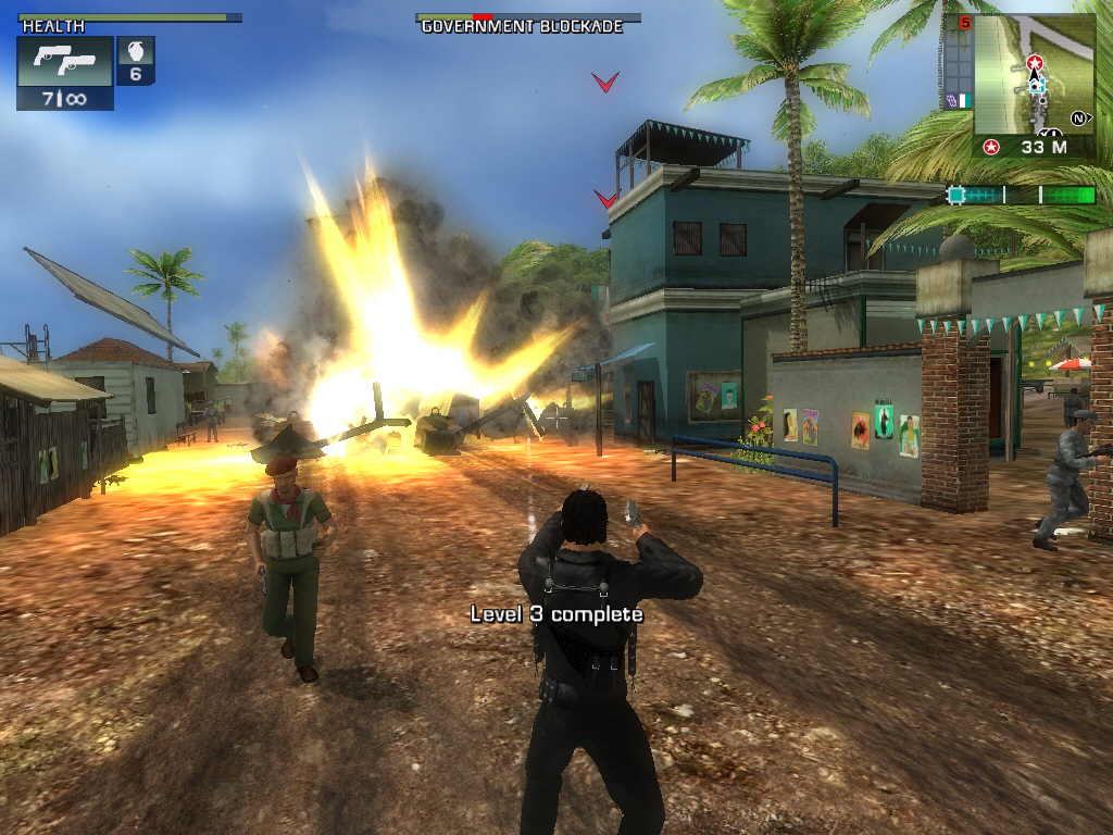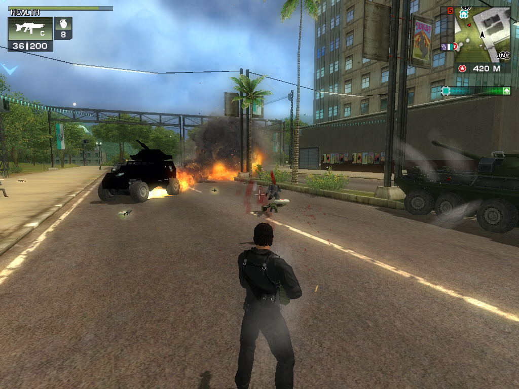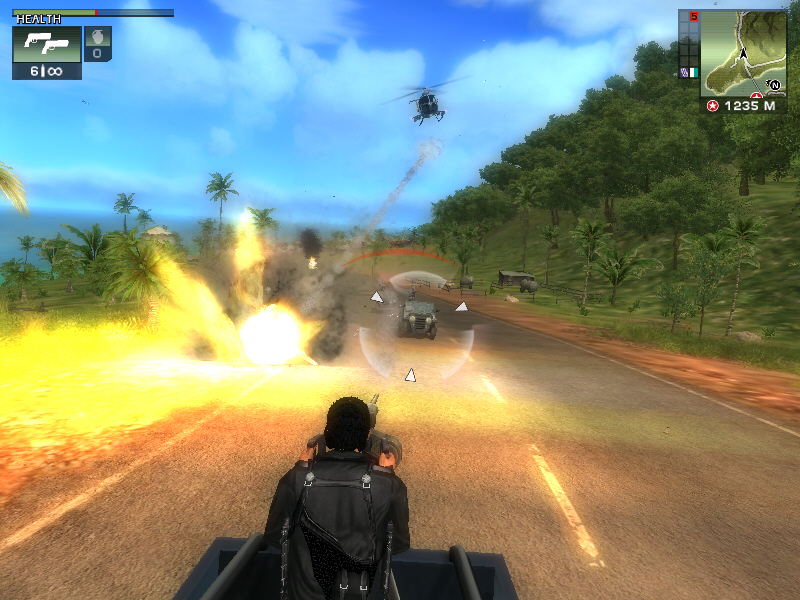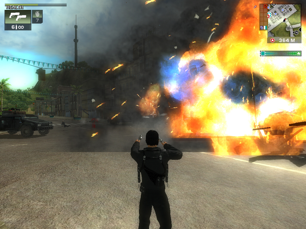 Just Causeに登場するのは,ハンドガン(ピストル),サブマシンガン,ショットガン,ロケットランチャー,アサルトライフル,そしてエクスプローシブ(爆発物)の7タイプで,それぞれのタイプごとに3種類の武器が用意されている。一度に所持できる武器は各タイプ1種類ずつのみとなるが,そもそもXboxやプレイステーション2でのリリースが念頭にあったためだろう,銃撃戦の難度は非常に低く設定されている。倒した相手は必ずヘルスパックや武器を落としてくれるので,ハンドガンと手榴弾だけでも十分にゲームを進めていけるのだ。