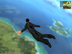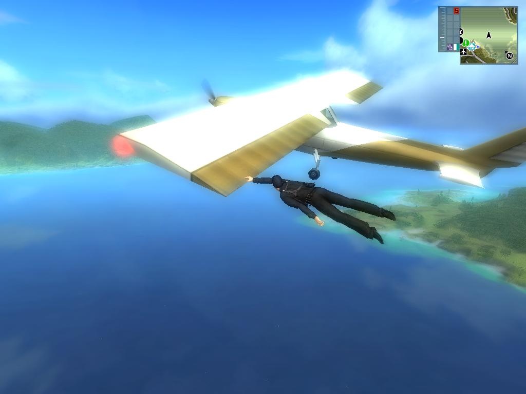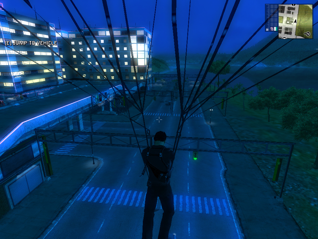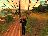 走行中の自動車でも,鉤縄(grappling hook)を使うとパラセイルモードになり,ロープの長さを調節して近くまで寄ってから車の屋根に着地できる。その後は別の車に飛び移ろうが,その車の運転手を外に蹴り出して自分のものにしようが自由自在だ。再びパラシュートを開いて空中に舞い上がることもできる。パラシュートや鉤縄はかなり使用頻度が高く,慣れれば崖っぷちから車ごと飛び降り,すかさずパラシュートで対岸の島まで飛んで行くとか,パラセイルを繰り返しながら進んでいくというような面白いこともできる。