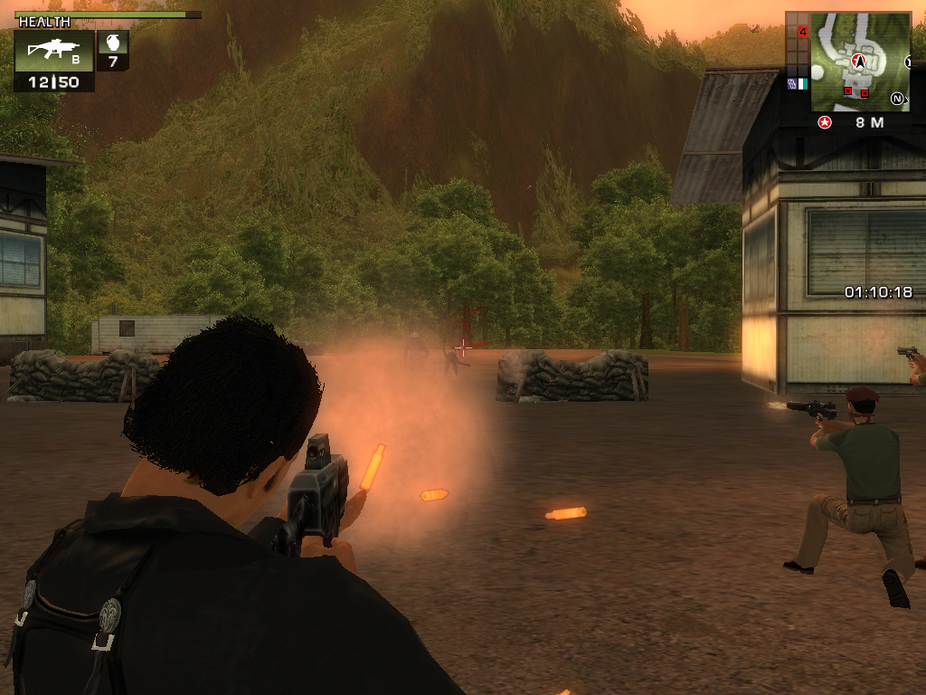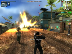 残念なのが敵のAI(思考ルーチン)だ。敵は直線的に進んでくる以外に能がなく,ごくたまに手榴弾を投げ込まれてダメージを受けたりすると,逆に感心してしまうほどである。プレイヤーの目の前に割り込んできた仲間のゲリラ兵を誤射すると,怒って銃口を向けてくるなんてこともしばしばで,優秀といえるかどうかは微妙。倒れるときのアニメーションや流血シーンのリアリティも薄く,人と戦っているよりは「シリアスサム」風のワラワラと出てくるモンスター達を撃ちまくっている印象だ。