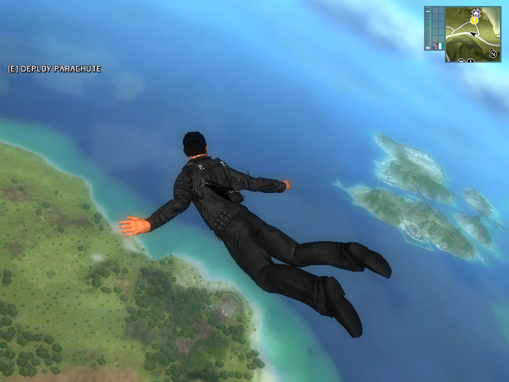 | セスナにつかまり,タイミングを見計らってフリーフォールでのスカイダイビング。高速での落下をギリギリまで楽しんだあとは,パラシュートを開いて目的地付近へと降り立つ……。炸裂するアクションがJust Causeの醍醐味だ | ||
