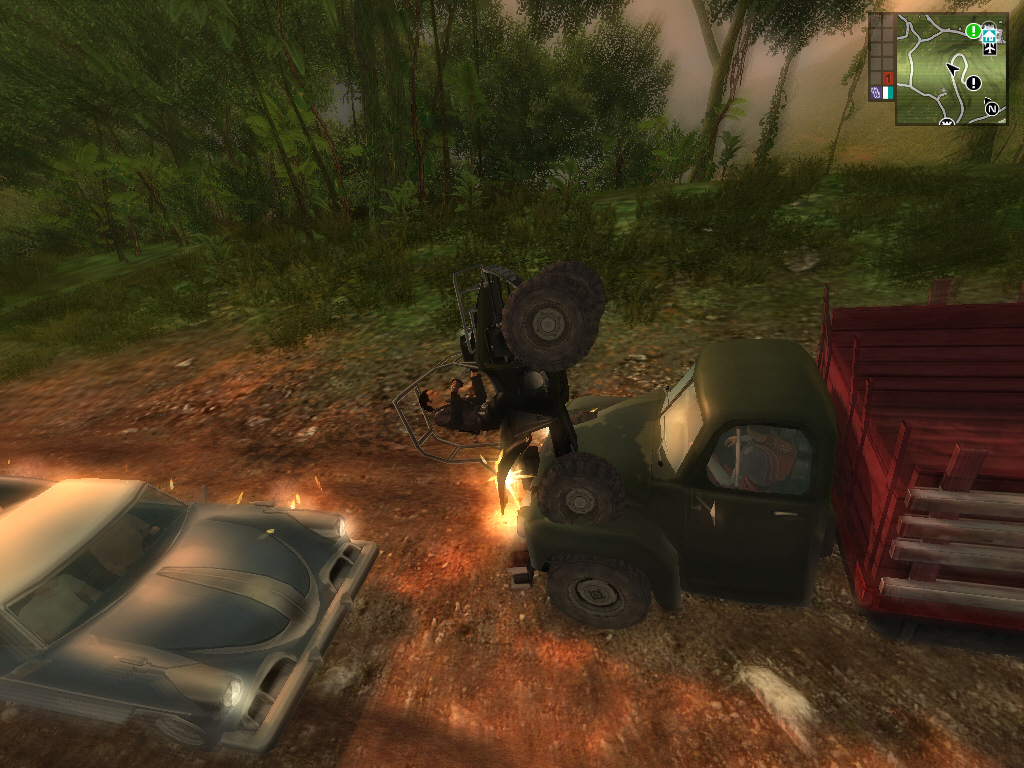 ほとんどのミッションは,派手なアロハシャツに身を包んだロバート・デ・ニーロ風のCIA要員,Tom Sheldon(トム・シェルダン)から任務を受けたあと,用意された自動車やスピードボートで目的地へと向かうことになる。手持ちの車がなかったり事故で壊れたりしても大丈夫。近くの道路や村へ行けば地元民がひっきりなしに往来しており,それらを簡単にカージャックできるのだ。このへん,GTAとよく似ている。