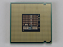 | Core 2 Extreme QX6700のCPU底面。LGA775パッケージのCPUという意味では,従来のCore 2 Duo系デュアルコアCPUと変わりない外観だ |