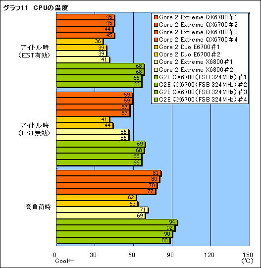 EISTが有効で,動作クロックが1.6GHzまで落ちている状態では目立たないものの,無効化されると,既存のCore 2シリーズと比べて,Core 2 Extreme QX6700の温度が高いのが分かる。また,高負荷時で比較すると,Core 2 Extreme QX6700のファン回転数が,Core 2 Extreme X6800やCore 2 Duo E6700のそれよりも,耳で違いを聞き分けられるほど自動的に引き上げられるにもかかわらず,CPU温度は80℃前後にまで達してしまう。