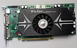 | WinFast Duo PX6600 GT TDH Extreme Version。2個のグラフィックスチップを1個の大きなファン付きチップクーラーで冷却する仕様だ 問い合わせ先:アスク(販売代理店) TEL:03-5215-5650 |