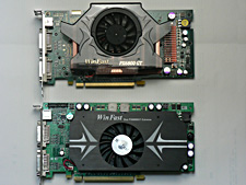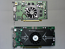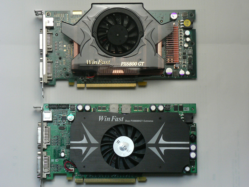 | PX6600GT(カード長174mm)との比較(左)と,PX6800GTとの比較(右)。PX6800GTのカード長は216mmなので,Duo PX6600GTのカードサイズはGeForce 6800 GT搭載製品と変わらないと考えておけばいいだろう | |