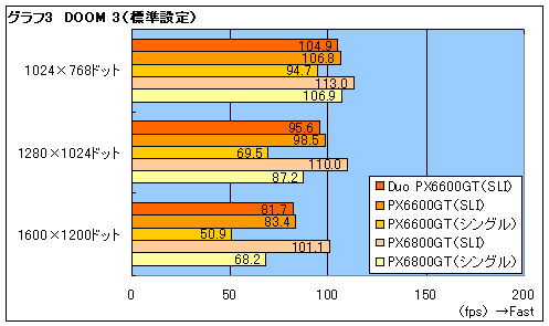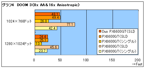 次に「DOOM 3」のTimedemoを利用し,平均フレームレートを計測してみた(グラフ3,4)。標準設定で比較すると,解像度が高くなるにつれDuo PX6600GTとPX6600GT×1の差は大きくなり,1600×1200ドットでは61%の差が付いている。また,グラフィックスチップに対する負荷が高い8x AA&16x Anisotropic適用時は,解像度にかかわらず85〜86%ものフレームレート向上を確認できた。ただし,PX6800GTの1枚差しと比較すると,差は最大でも20%程度。1024×768ドットモードの標準設定では(ほぼ誤差ではあるが)WinFast PX6800 GTの1枚差しのほうが上回っている。