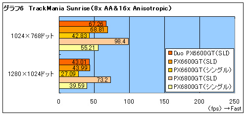 続いて「TrackMania Sunrise」を実行し,53秒程度で1周する「Paradise Island」というマップのリプレイを3周繰り返した。そして,そのときの平均フレームレートを「Fraps 2.60」で計測し,グラフ5,6にまとめてみた。TrackMania Sunriseでは,PX6600GT×1と比べて,標準設定で33〜49%,8x AA&16x Anisotropic有効時は57〜58%ほど,Duo PX6600GTのフレームレートが向上しているのが分かる。PX6800GTとの比較でも,標準設定で20〜31%,8x AA&16x Anisotropic有効時で9〜22%と,比較的順当なスコアの向上が確認できている。