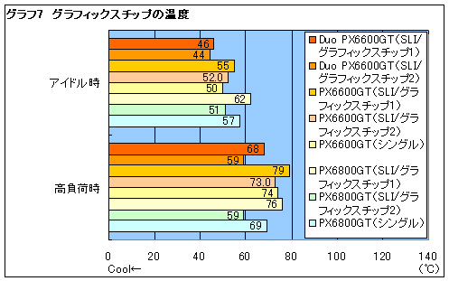 結果は,グラフ7に示したとおりだ。アイドル時で比較すると,PX6600GT×1で50℃なのに対し,Duo PX6600 GTは一つめのチップが46℃,二つめは44℃で,4〜6℃低い。また,PX6800GTとの比較では11〜13℃も低くなっている。高負荷時で比較しても,PX6600GTが74℃まで上昇しているのに対し,Duo PX6600GTは68℃と59℃。PX6600GTのSLI動作時と比べてもこの傾向は変わらず,Duo PX6600GTが搭載するクーラーの冷却性能はかなり高いといっていいだろう。