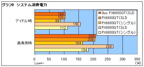 PX6600GT×1と比べると,Duo PX6600GTの消費電力は高く,PX6600GT×2とほぼ同じというのは,まあ,予想どおりの結果だろう。PX6800GT×1と比べて,高負荷時の消費電力が24Wほど高いのは少々気になるところだ。