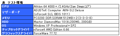 それでは,実力を検証していこう。テスト環境は表に示したとおりである。なお,今回テストに利用したA8N-SLI Deluxeでは,グラフィックスカードを2枚装着してSLI動作を行う場合,SLIセレクタカード「ASUS EZ Selector」を「Dual Video Cards」モードに設定する必要があるが,Duo PX6600GTを利用する場合は「Single Video Card」のままでいい。