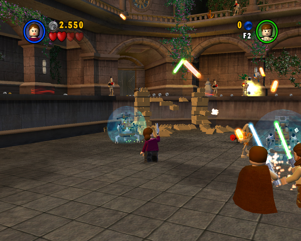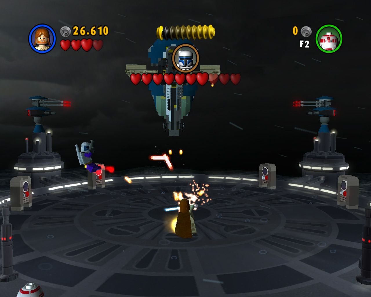 | エピソードIIでの捕らえられたアナキン,オビ=ワン・ケノービ,パドメを処刑場から救出するシーン。次から次へと湧いてくるドロイドを粉砕するのが気持ちよくて,アナキンたちを助けるのも忘れて戦いに没頭することもしばしば |