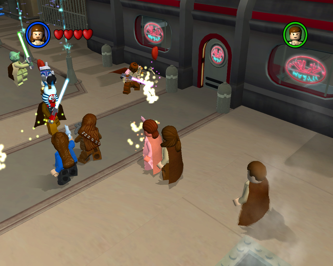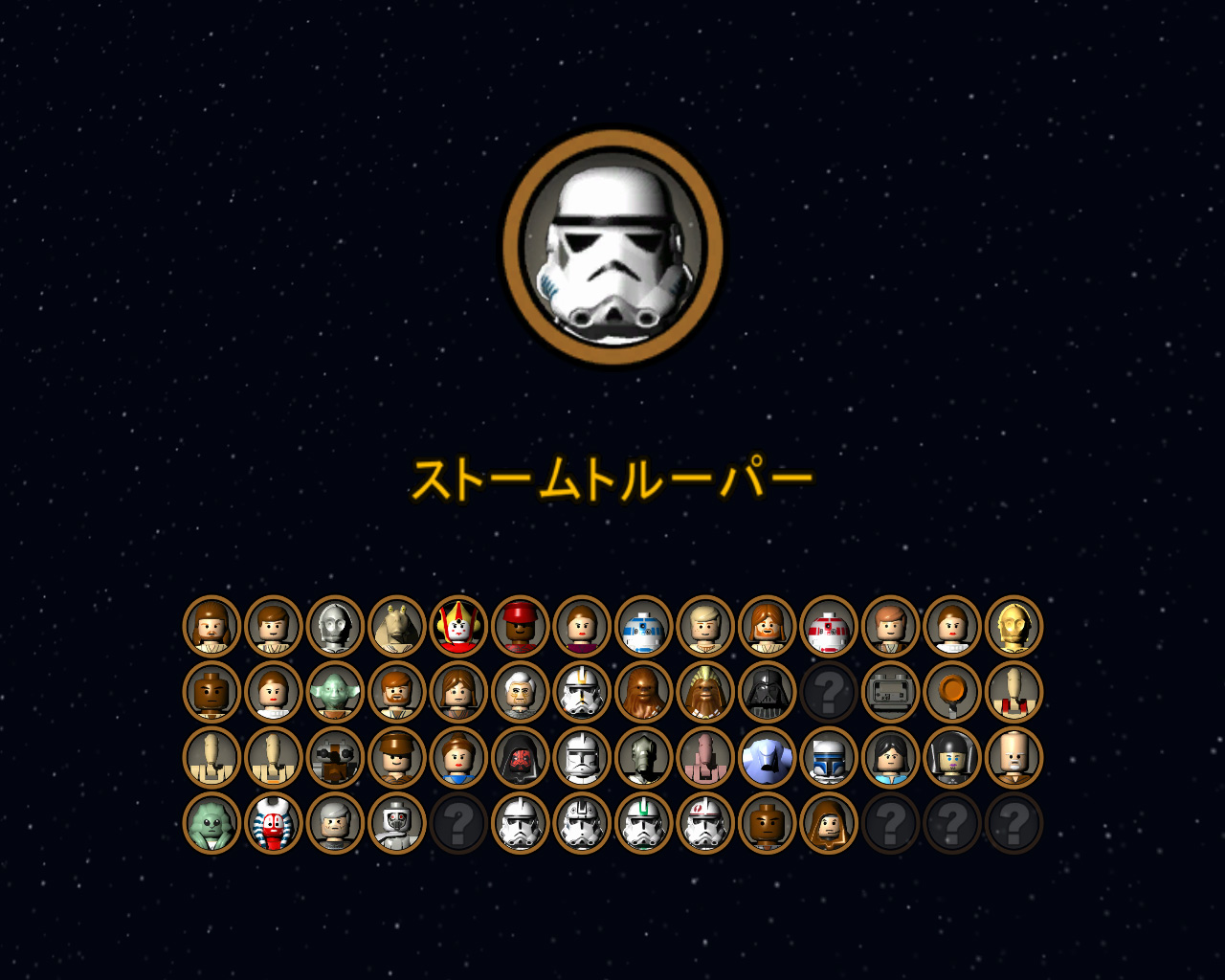 シナリオモードを進めていくと,徐々に使用できるキャラが増えていく。チャプターをクリアすれば使用できるようになるキャラや,ゲーム中に集めたコイン(レゴブロックでいうと1×1丸プレート)で購入できるキャラがあり,ジャー・ジャー・ビンクス,メイス・ウィンドウ,アナキン・スカイウォーカー,ジェンゴ・フェット,ダース・モール,パルパティーン,R4-P17,R2-D2,C-3POなどなど,最終的には56種類がフリープレイモードで使用可能となる。
