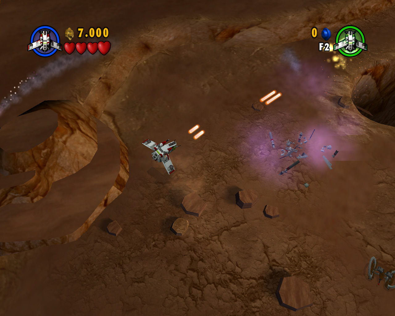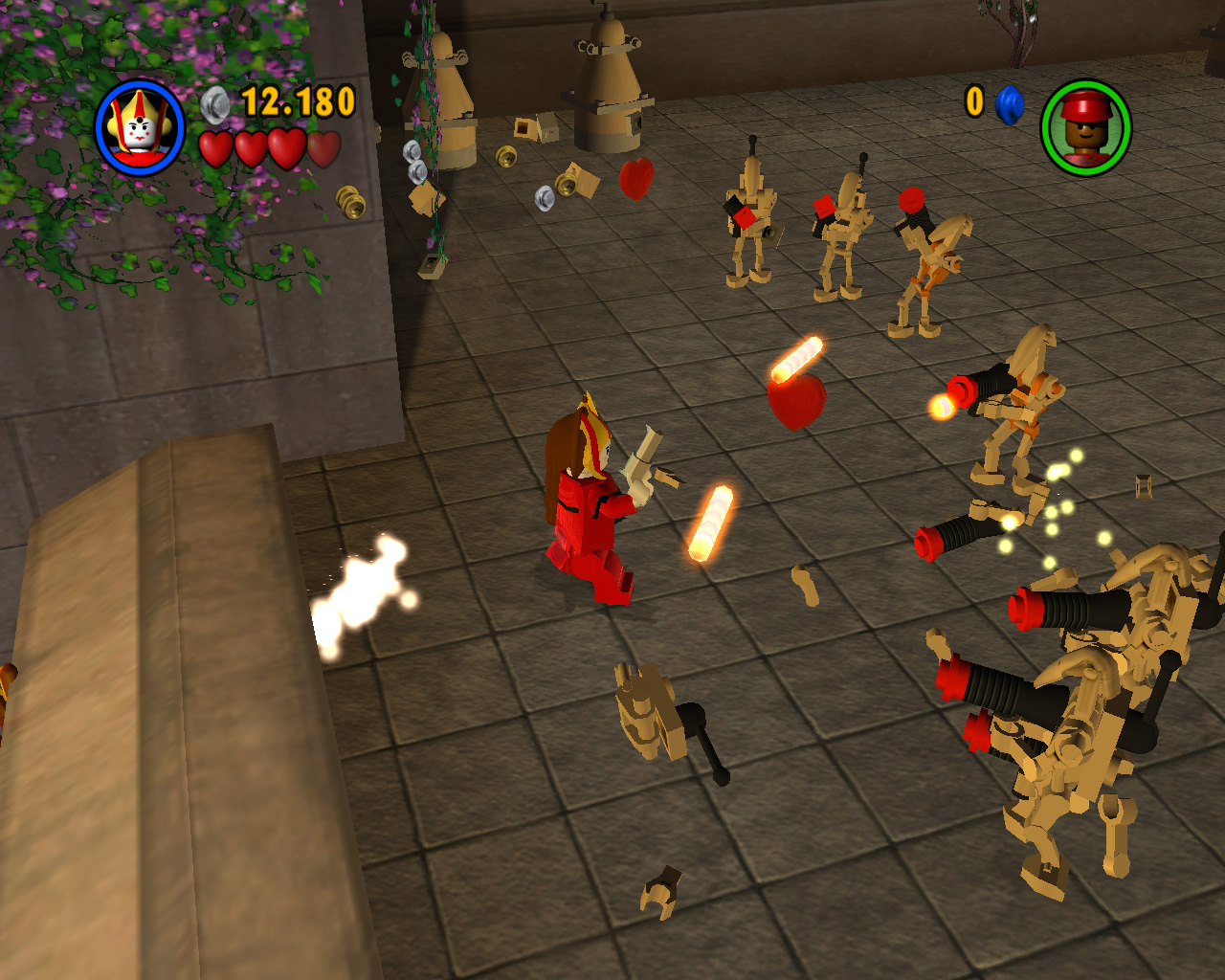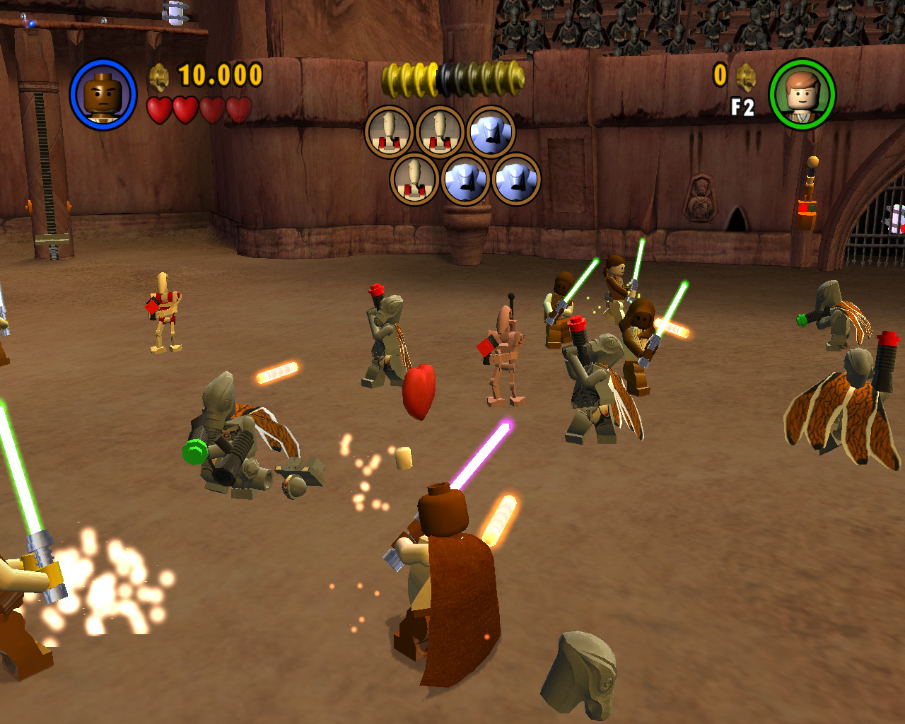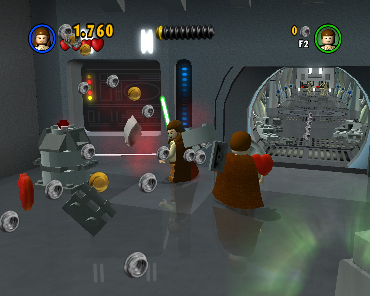 | ステージ内の至るところに破壊できるオブジェクトが用意されており,壊すとコインが飛び散る。これを拾い集めるのが意外と楽しい。キャラやエクストラアイテムの購入に必要だし,ジェダイ・メーターを満タンにするためにも全部拾い集めたい |