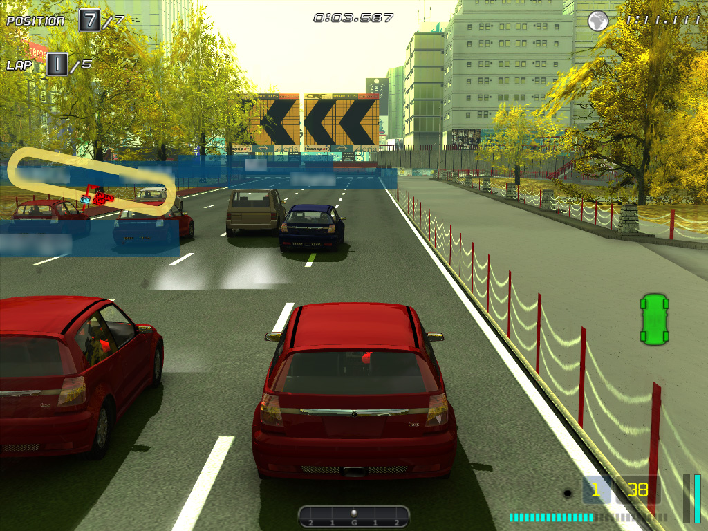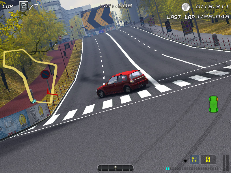 Short Circuit 1は,Around the block reverseをもう少し複雑にした形で,コーナー数が三つ増えて八つになっている。しかし,難度の高い複合コーナーはないので,コーナー手前でキッチリ減速さえすれば,切り抜けられるはず。ただし,あくまでもストリートなので,大通りには中央分離帯があり,そこに街灯が等間隔で立っている。しかも街灯は,コーナー手前の微妙な位置にまで立っているので,サーキットのように自由にラインを取れないのが,イヤらしい。