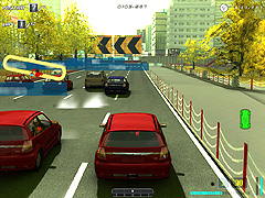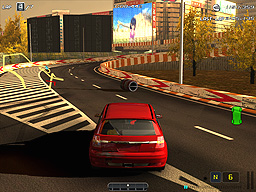 | 技術テストで走れたルートのなかで最も難度が低い「Around the block reverse」。5段階で1だ。これも反時計回り。コーナーを曲がった先の直線は,中央分離帯なしで片側3車線の道路になっているので,しっかり減速してから曲がれば,外側でクラッシュすることはまずないはず | |