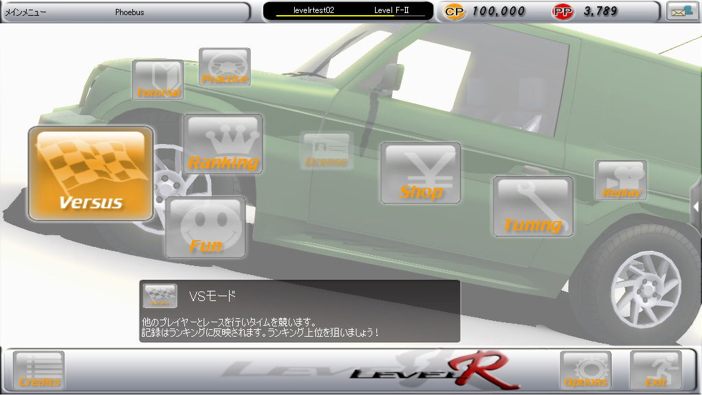 技術テストで用意されていたモードは,「Versus」「Tutorial」「Practice」「Ranking」「Fun」「License」「Shop」「Tuning」「Replay」の9種類。なお,本記事ではレースゲームとしての核であるVersusモード,そしてPracticeモードを中心として,コースの様子などに重点を置いてお伝えする。