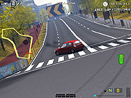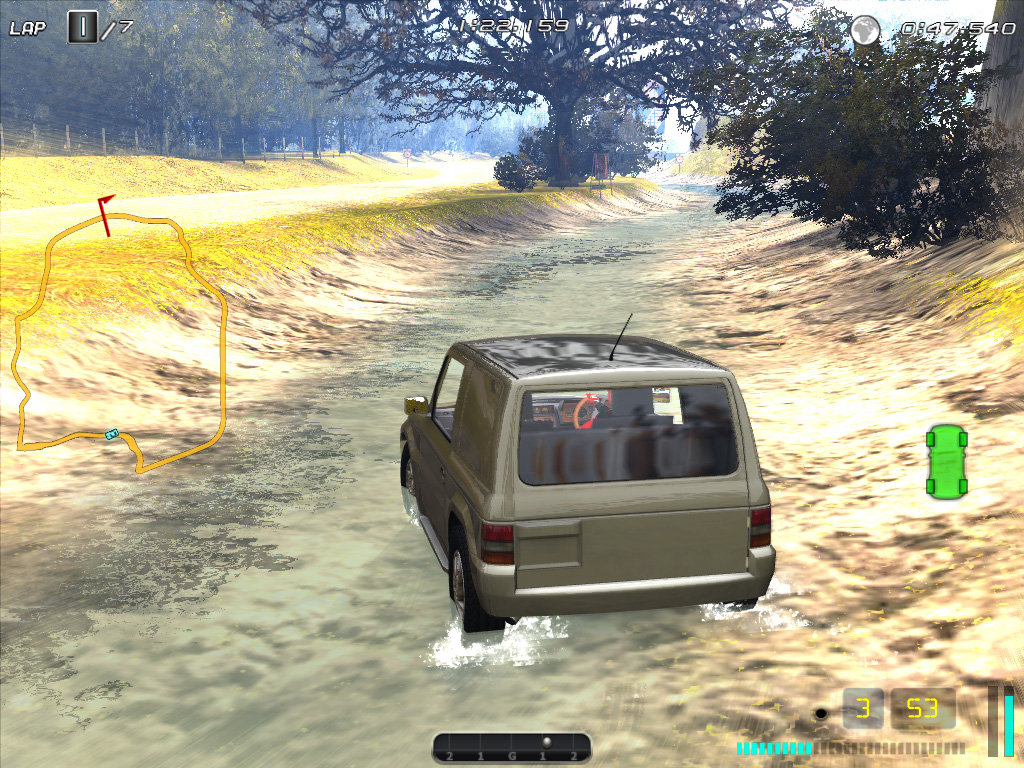 | 「Route #2」の特徴は,コースの一部が小川になっていること。非常にスリッピーな感触の路面である。四駆はサスが柔らかいので,ターマック区間でもスピードを出しすぎると,コーナーで粘りが効かないので要注意。壁に横っ腹をこすりつけることになる | |