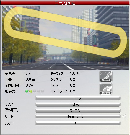 | 「Tokyo」マップのオーバルコース「Team drift」は,全長500メートルで,反時計回り。難度は5段階で2 |