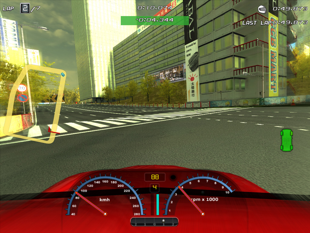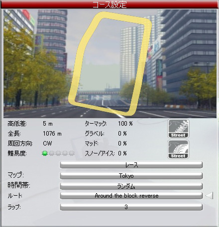 どうやら初心者向けには,Tokyoマップの縦の長方形のコース「Around the block reverse」がちょうど良かったようだ。コーナーはどこも直角ターンかそれに近いのだが,クリッピングポイントも分かりやすく,コーナー(直角ターン)を抜けやすい。また道幅が広いので,減速が不十分なままコーナーに進入してしまっても,なんとか抜けられることが多い。クローズドβテストに参加する人は,まずこのコースで練習を積むと良さそうだ。