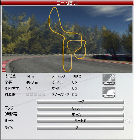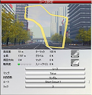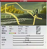 | 「Circuit」マップの「ルート5」。技術テストでは,サーキットはこの全周ルートのみだった。全長4km強と,実在するサーキットと同程度の長さの,反時計回りコース。直線が長く感じるのがこのコースの特徴だ。サーキットを攻めるには,エンジンパワーなどが必須だろう | |