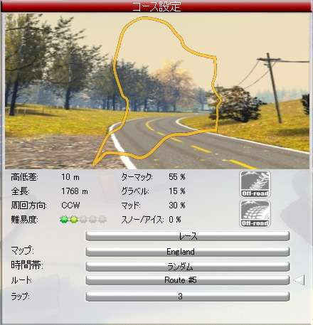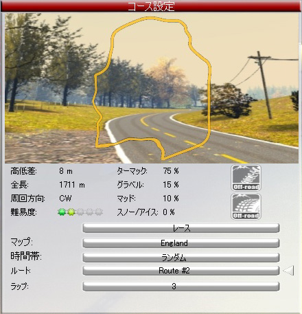 | 「England」マップの「Route #2」。1周が1.7kmあり,7周設定にした日には,ゴールまでかなりの時間がかかる。時計回りだ |