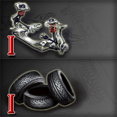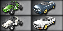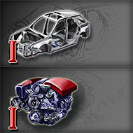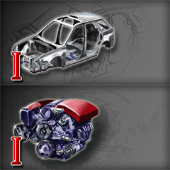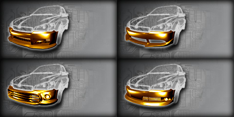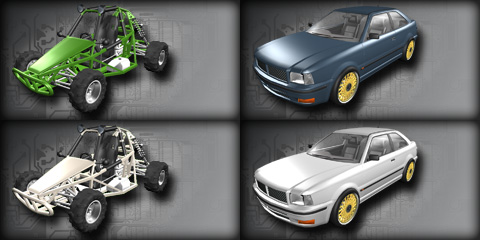 | Shopモードで購入できるパーツのうちの,ハンドリングに関するパーツ。サスペンション,タイヤ,ブレーキなどがラインナップされていた | デフォルト車種の一つ,Corus S2用のFバンパー。もう一つのデフォルト車種C Racer Xや,Shopで購入できるBuggy Evo IIとQuadro SD T54用にも,4種類ずつのバンパーが存在しているようだ |