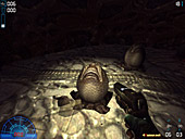 | エイリアンの卵。あまり近づくとフェイスハガーが飛び出すぞ | ミサイル直撃! さすがに親玉エイリアンだけあって,一撃では死なない | 対人間用の視界では人間が光って見えるので,遠いところにいてもすぐ分かる |